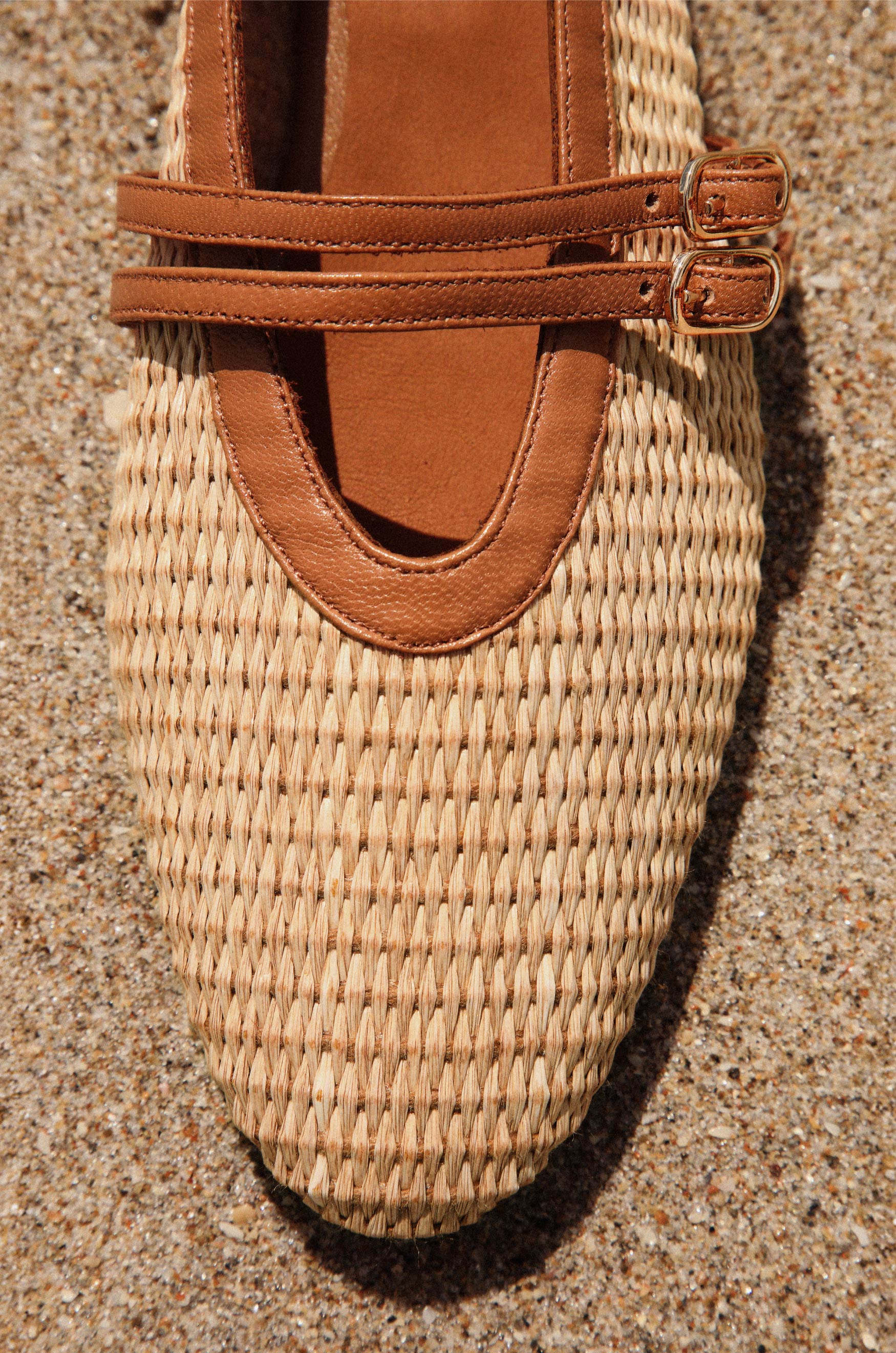 Ballerina de rafia con terminaciones en cuero y pulsera con hebilla.
