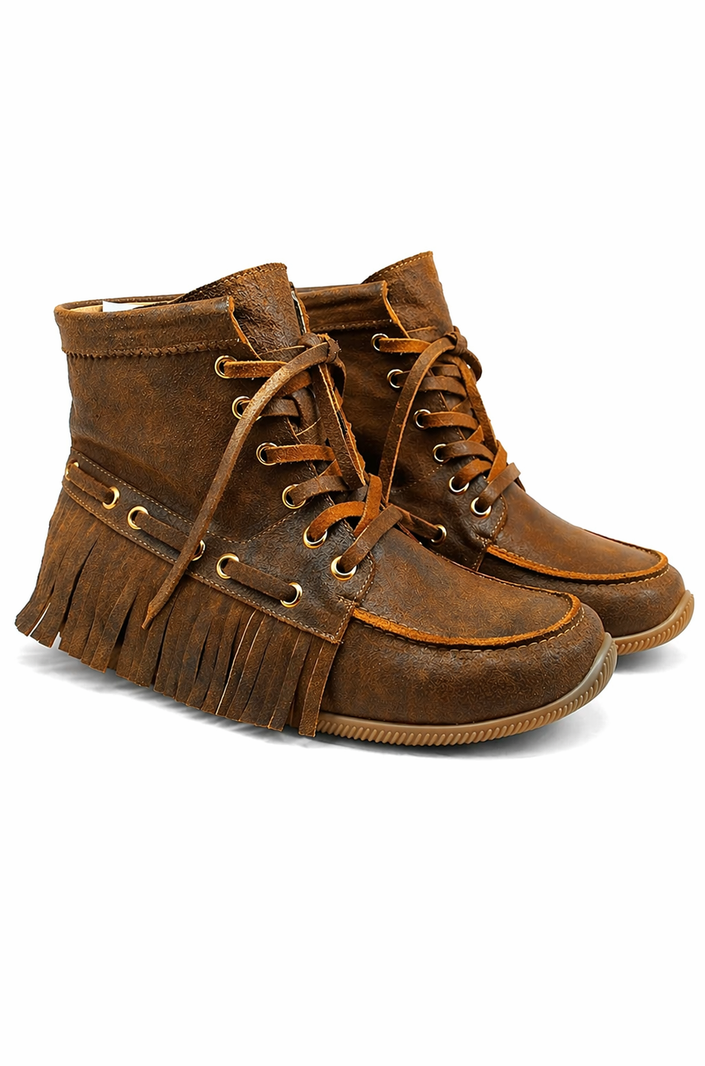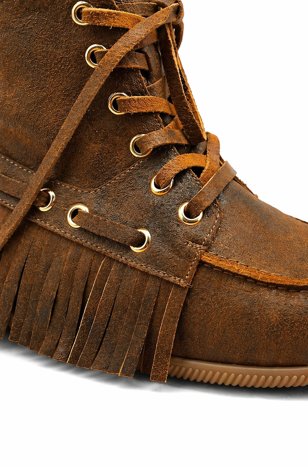 Este borcego en gamuza marron combina comodidad y estilo en un diseño lleno de personalidad.