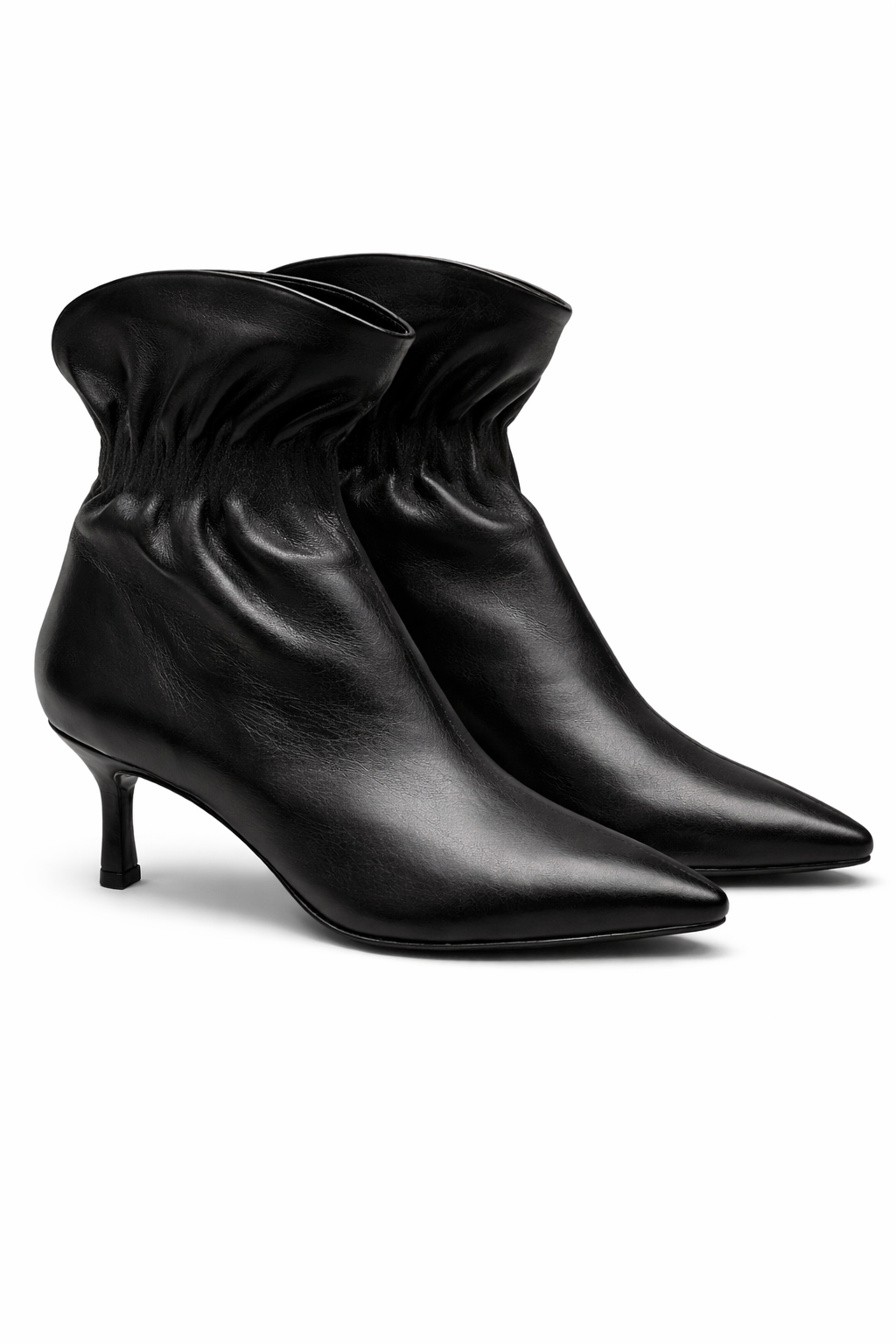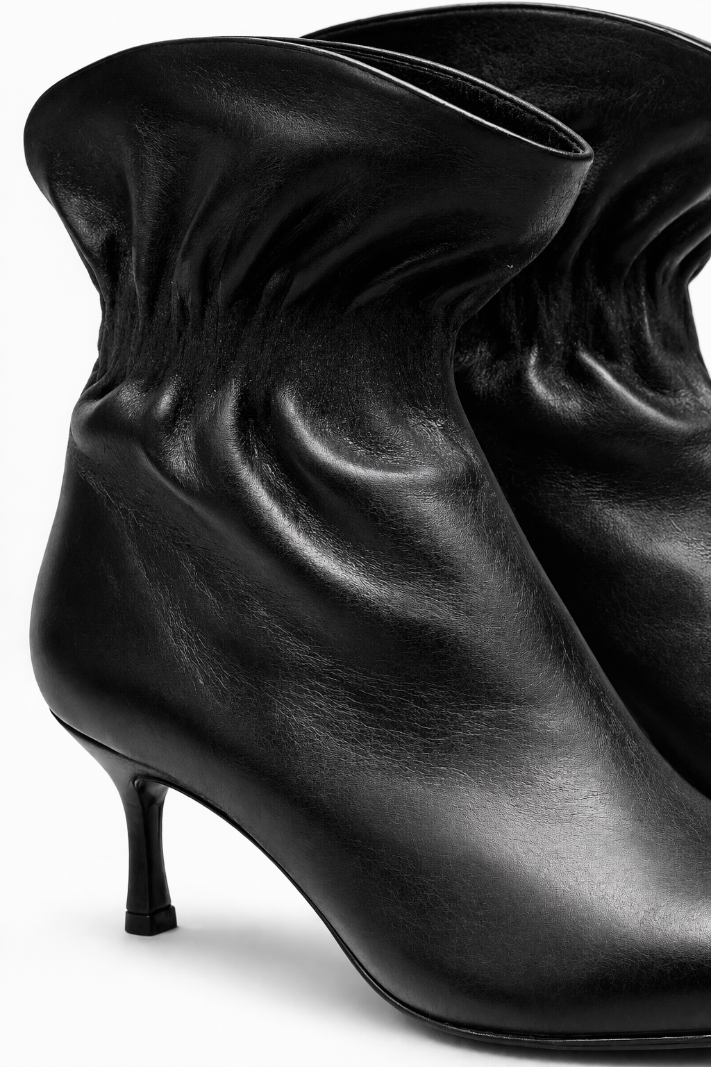 Bota de cuero con caña fruncida y diseño sofisticado que aporta movimiento y estilo. De taco fino y punta estilizada, es elegante y canchera. Ideal para destacar cualquier look con un toque moderno.