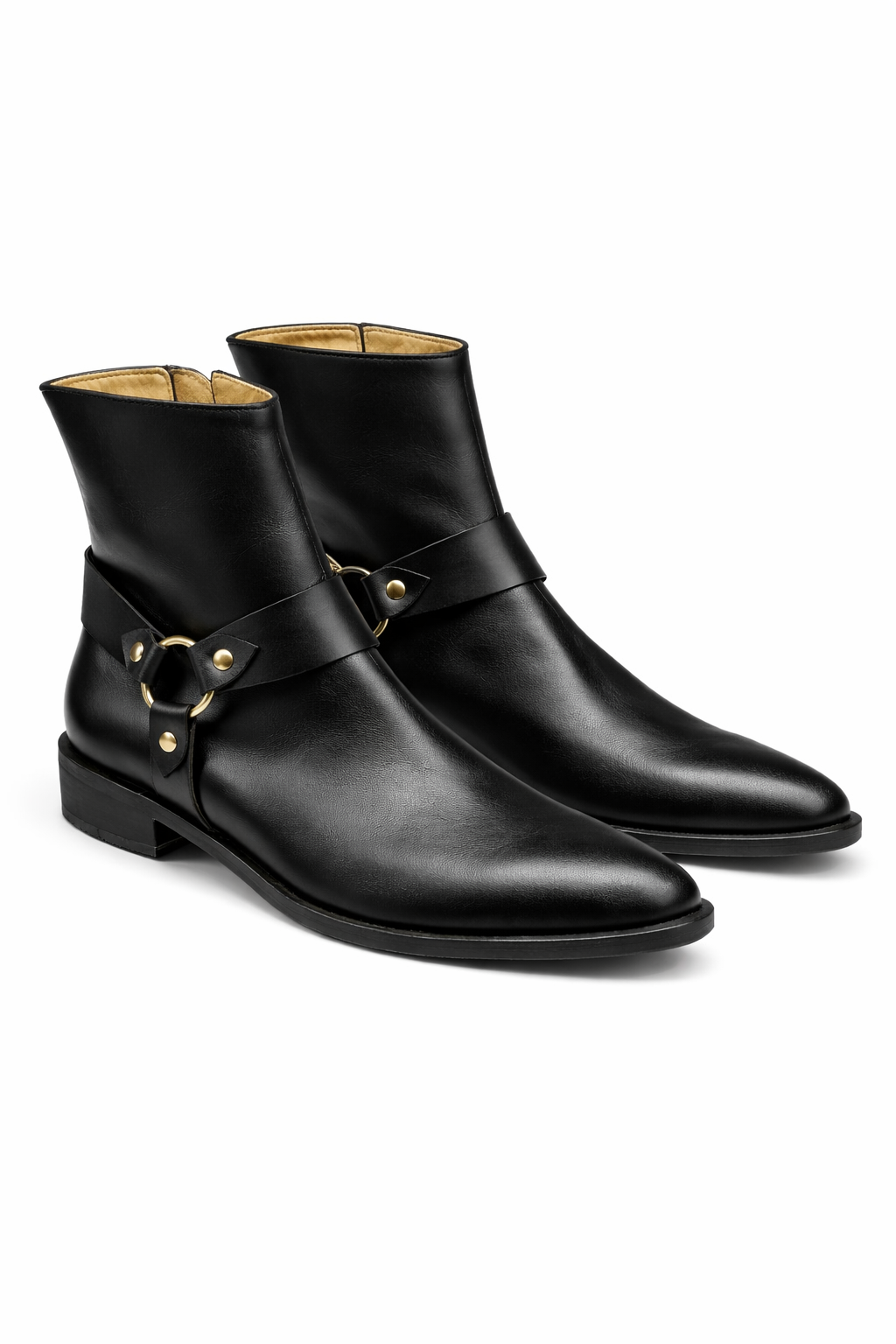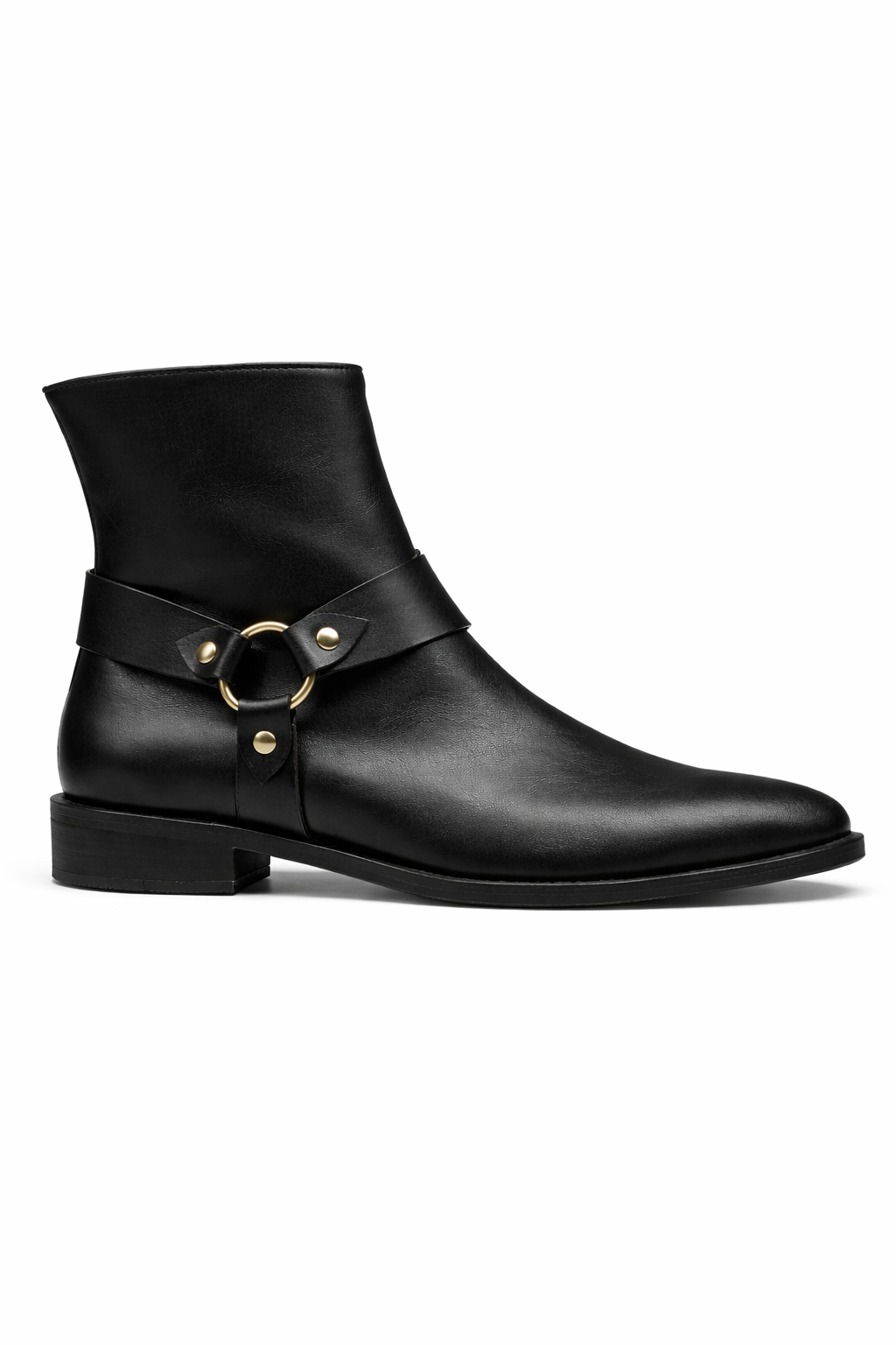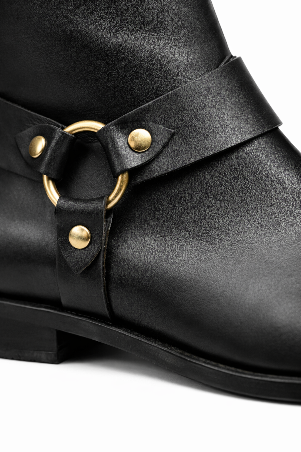 Bota caña baja de cuero con aplique dorado en sus laterales.