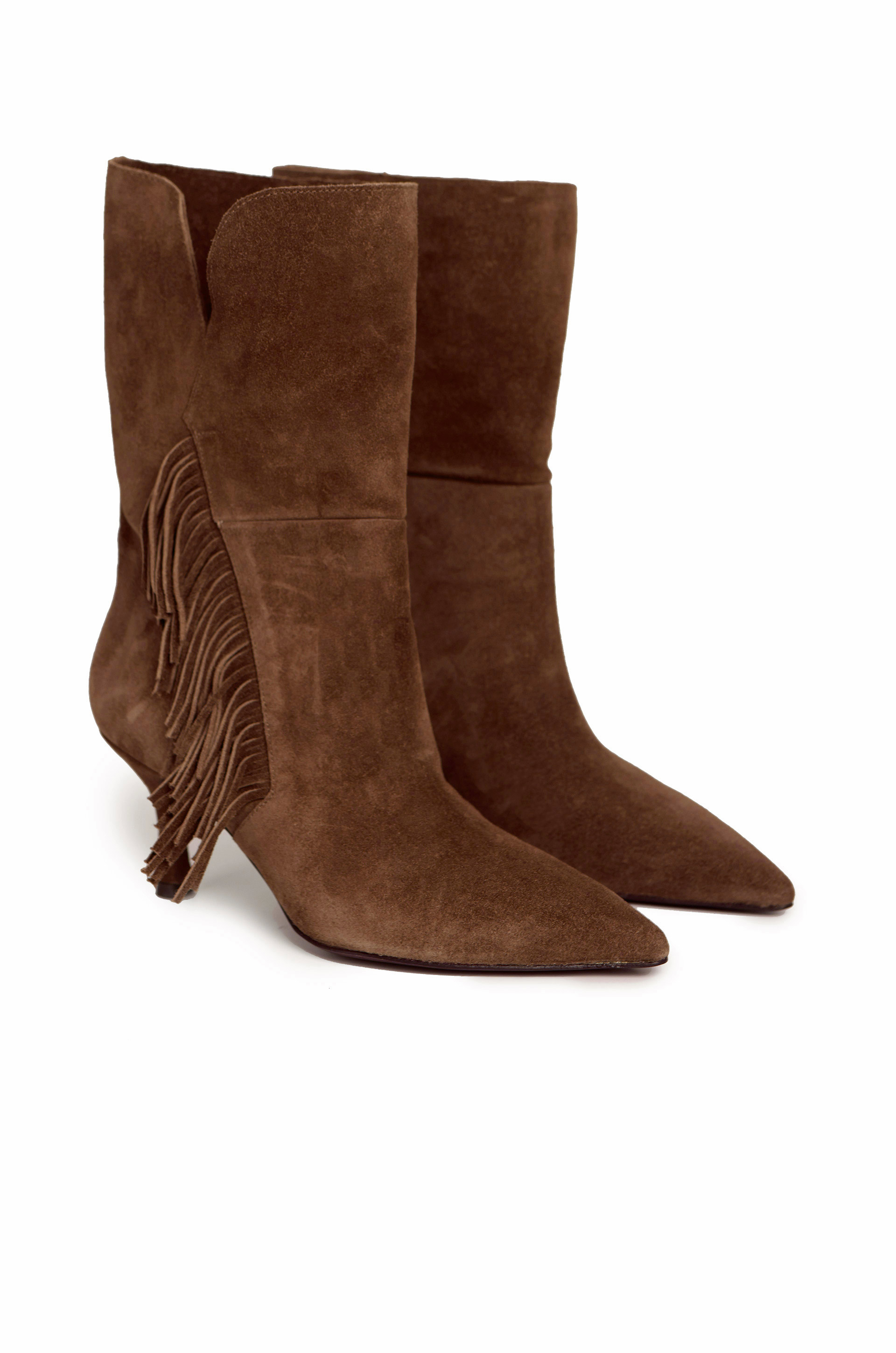 Esta bota de gamuza color suela combina un diseño clasico con un detalle que marca la diferencia: los flecos laterales que aportan movimiento y un aire canchero al look.