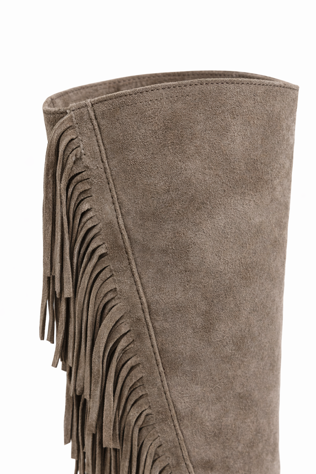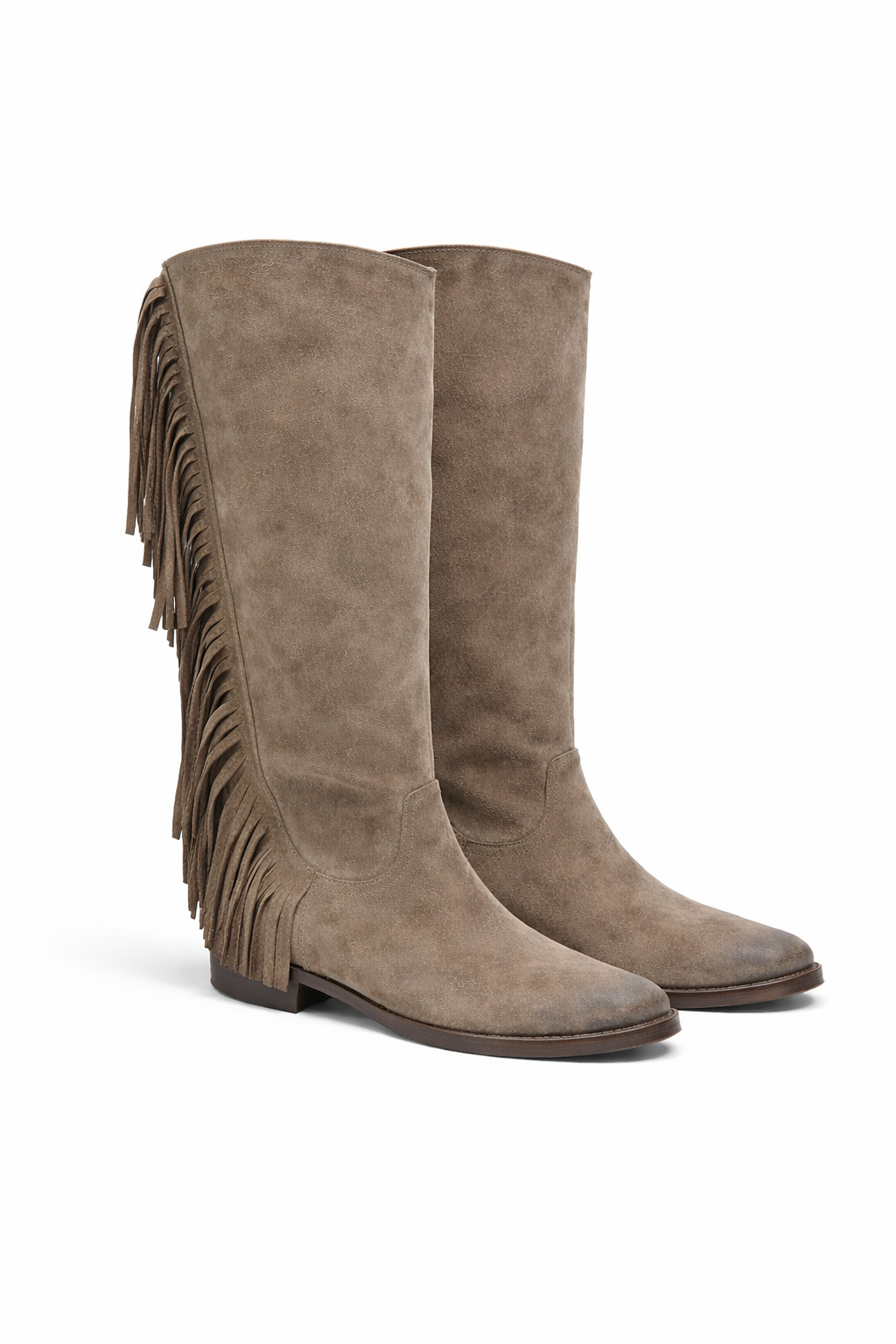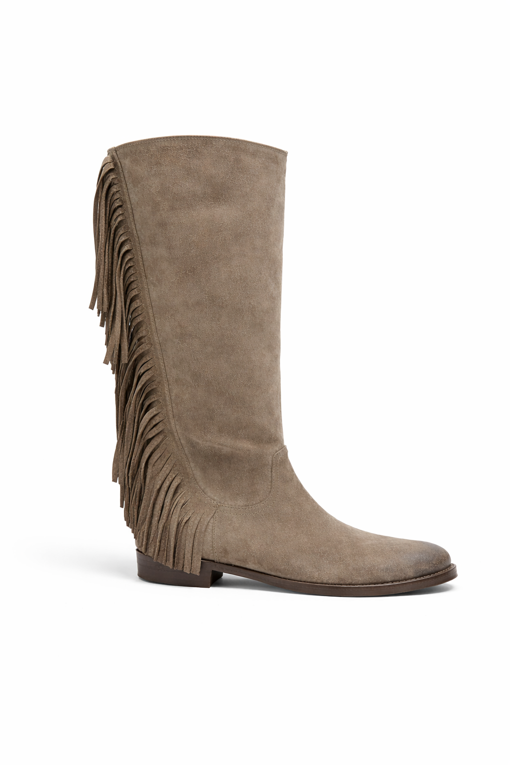Bota de caña alta de gamuza, con flecos en sus laterales que añaden un toque de movimiento.