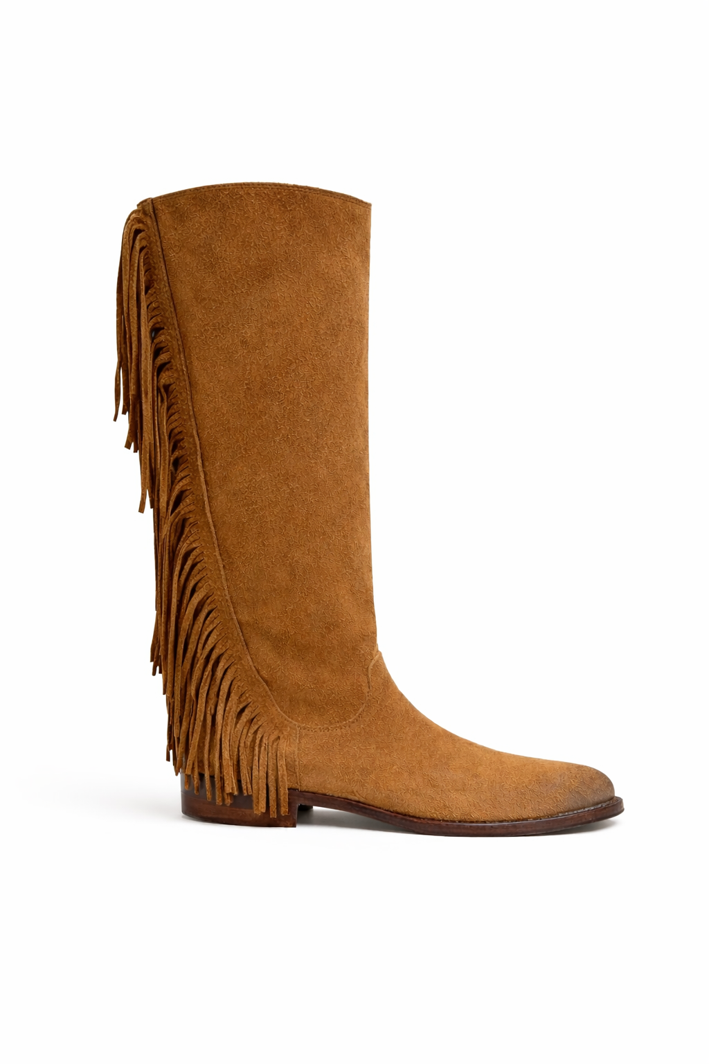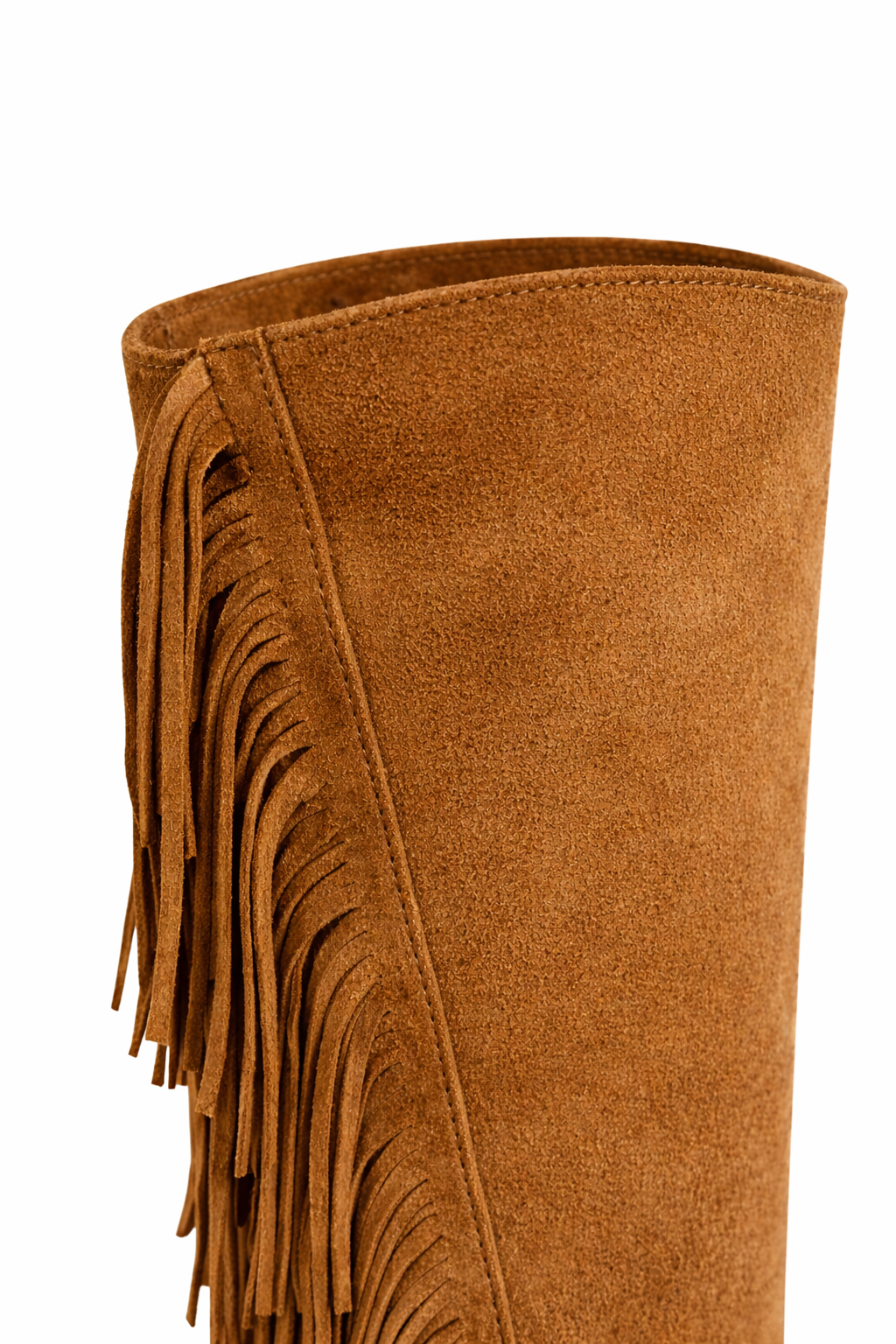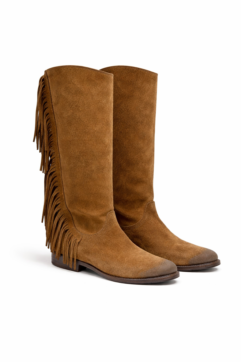 Bota de caña alta de gamuza, con flecos en sus laterales que añaden un toque de movimiento.