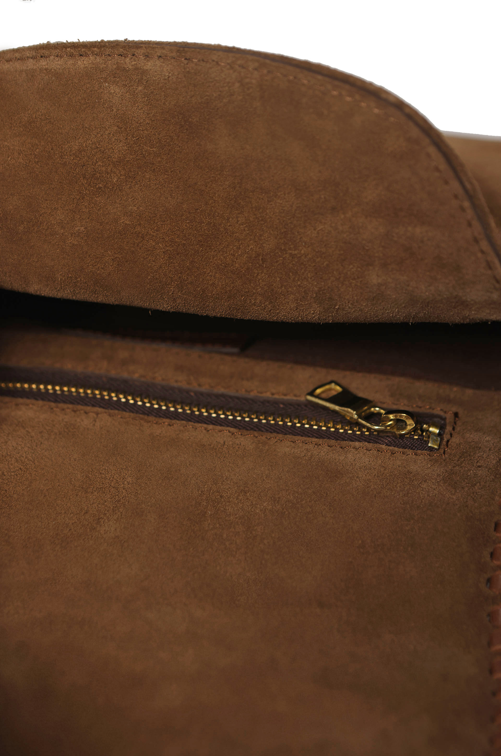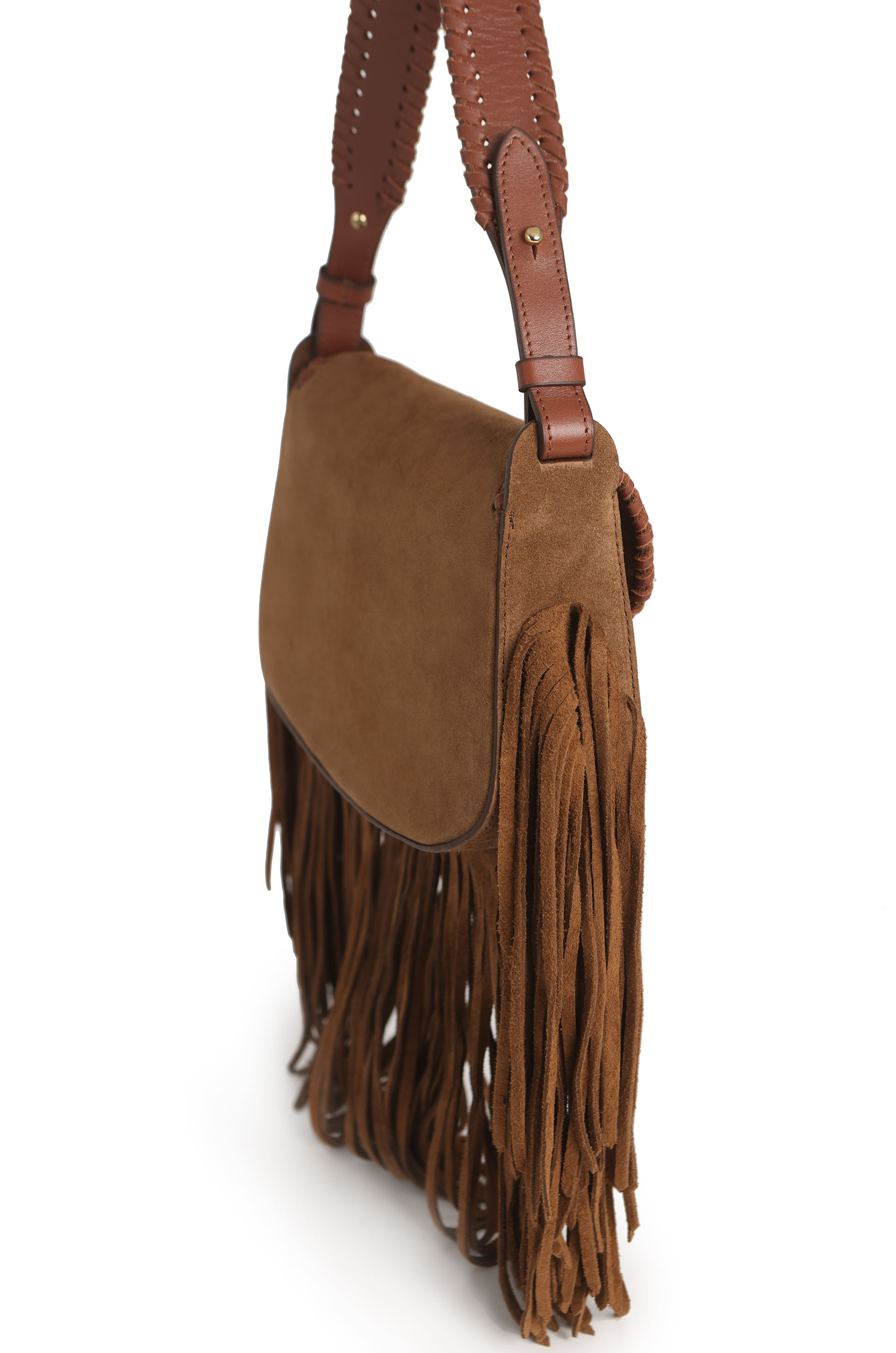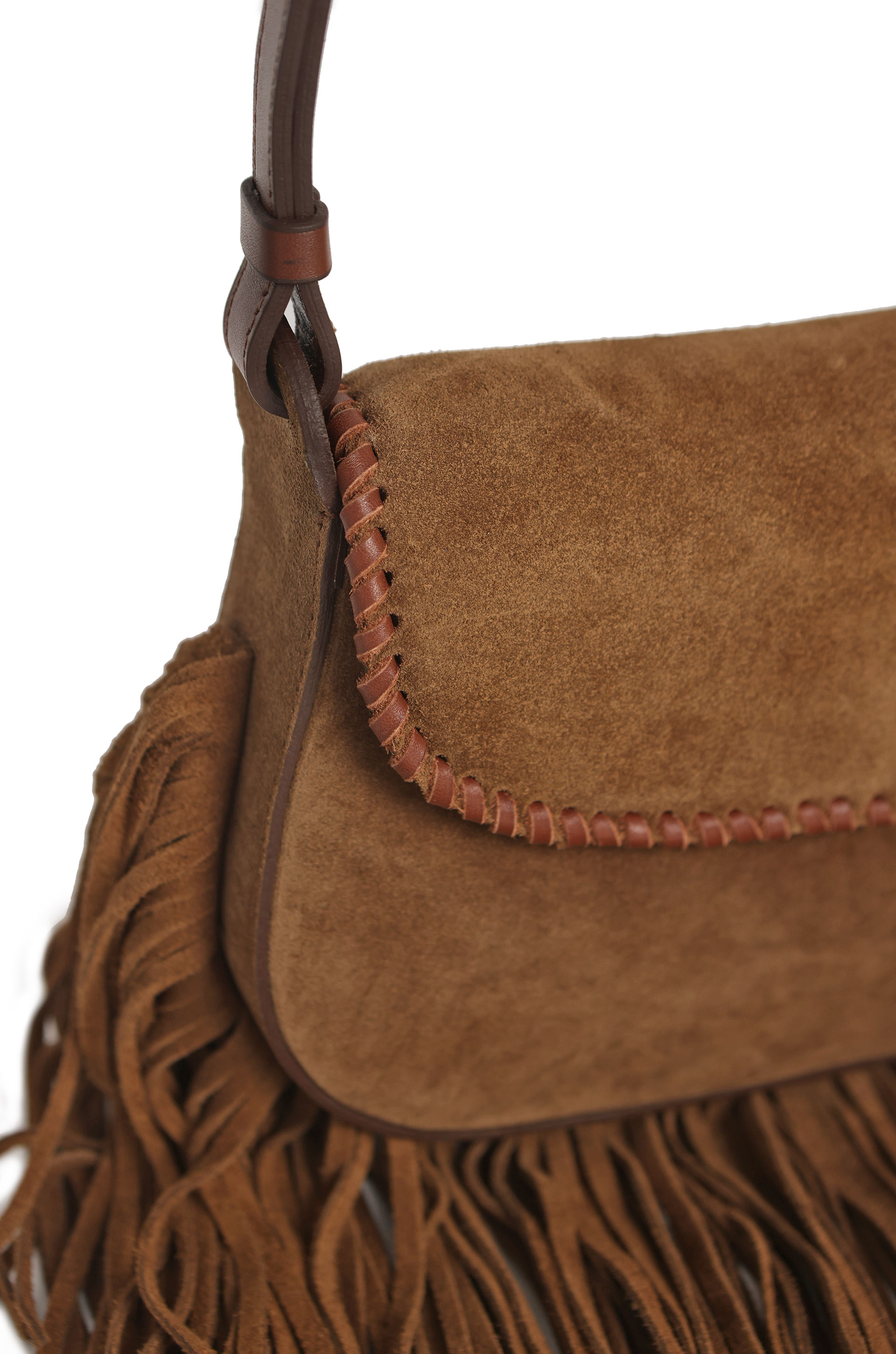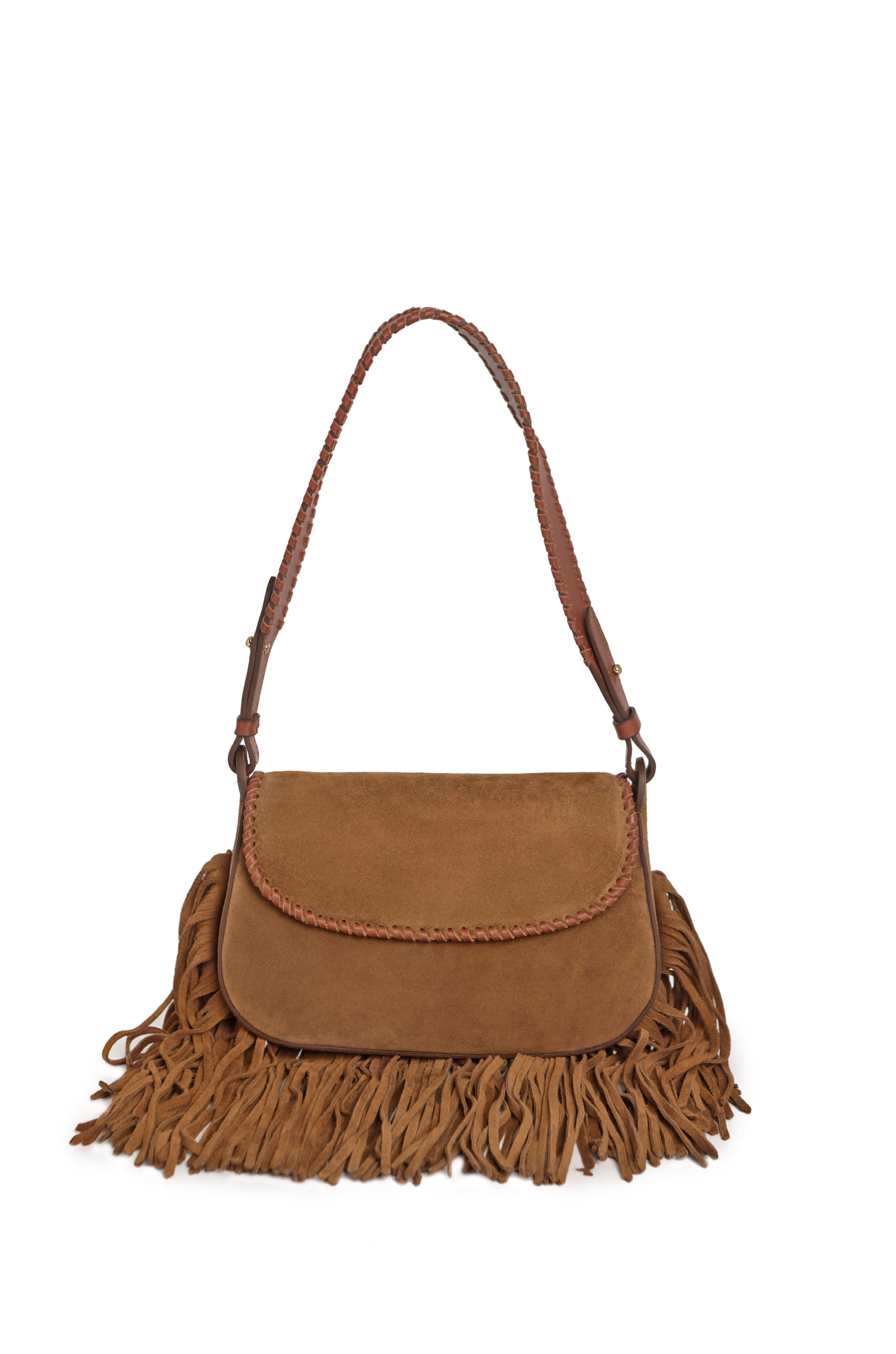 Esta cartera en gamuza se destaca por su diseño relajado y lleno de personalidad. Los flecos largos en el frente aportan movimiento que lo convierte en una pieza protagonista.