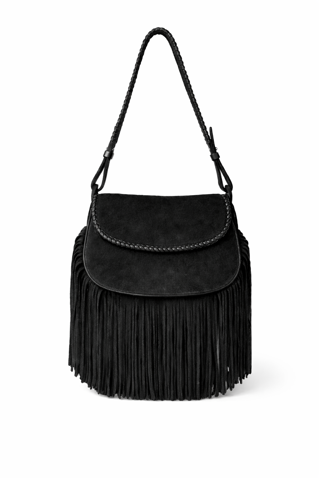 Esta cartera en gamuza se destaca por su diseño relajado y lleno de personalidad. Los flecos largos en el frente aportan movimiento que lo convierte en una pieza protagonista.