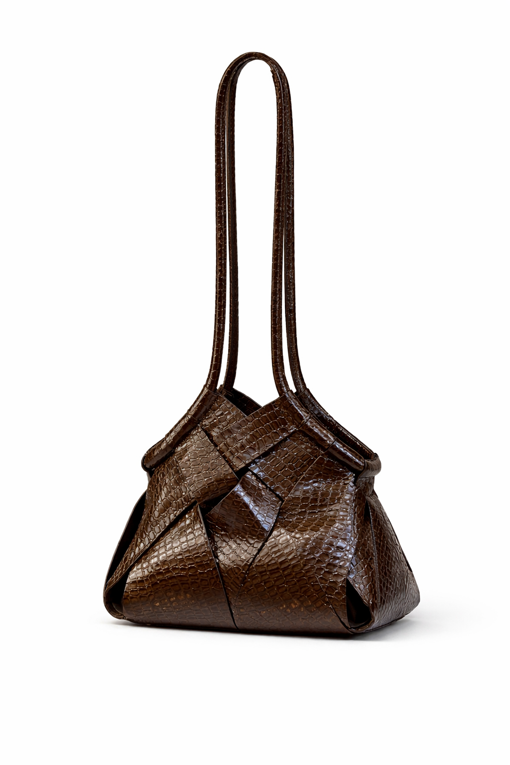 Cartera de cuero tipo croco entrelazada, combina elegancia y originalidad en cada detalle.
