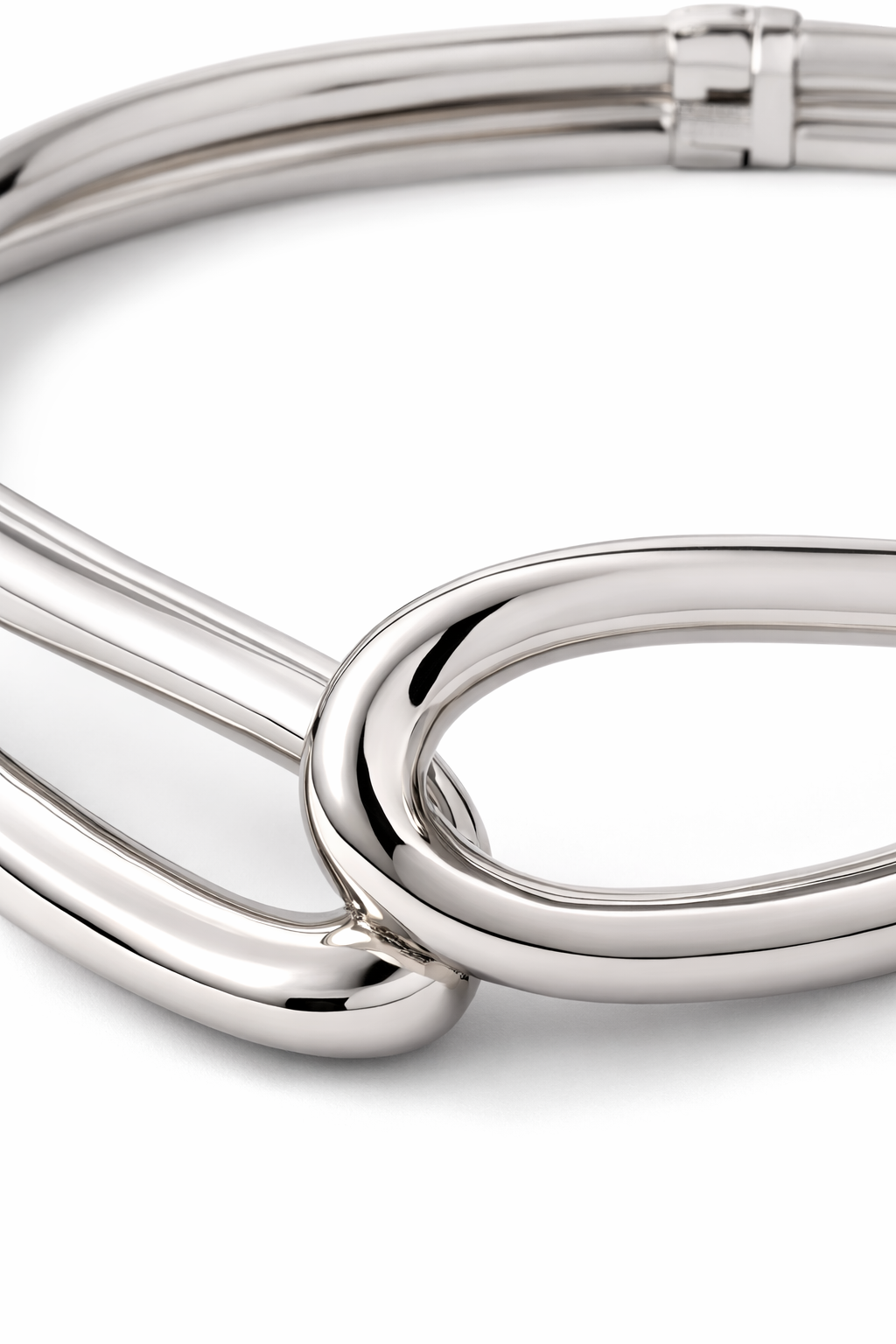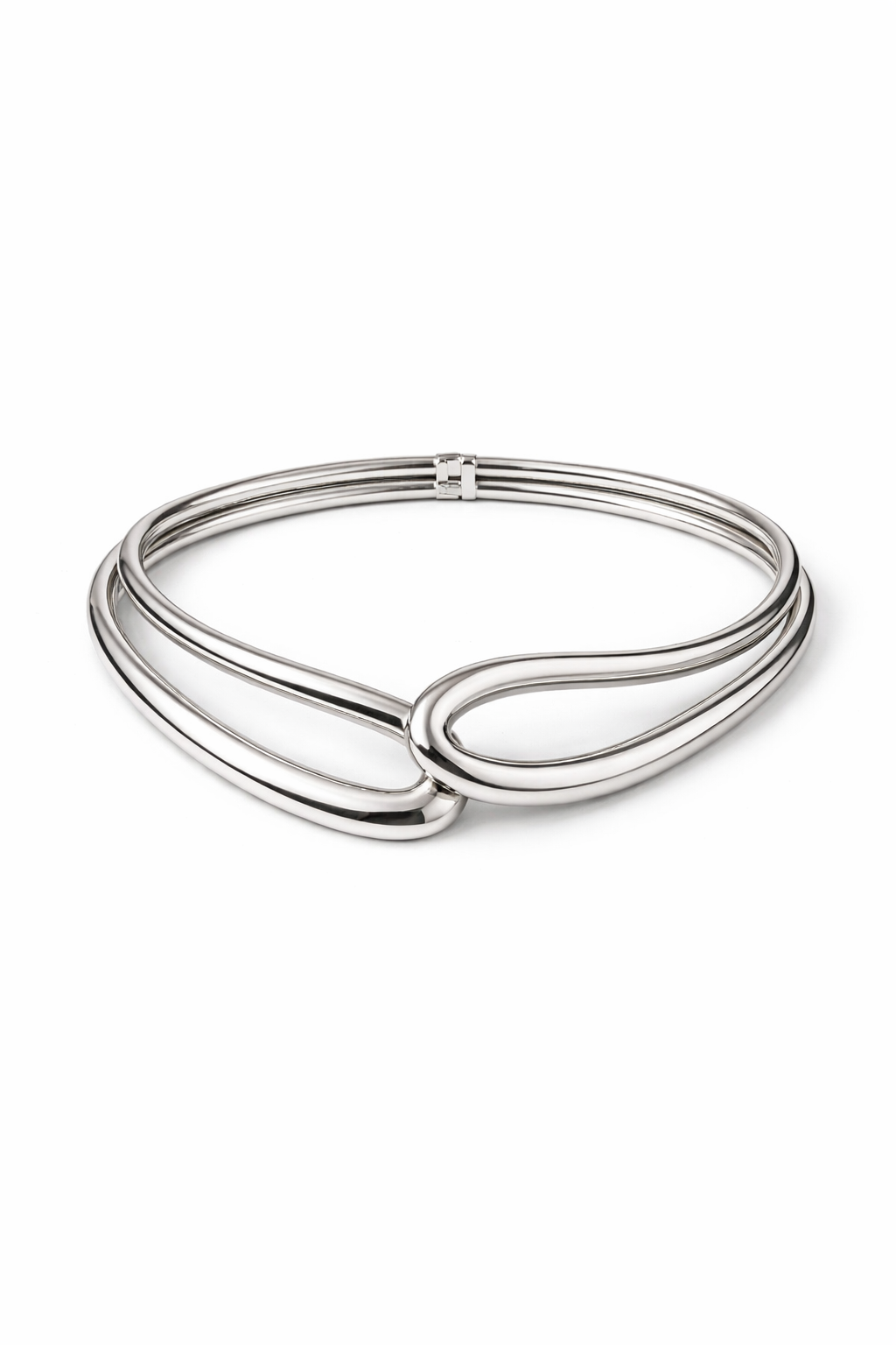 Este collar se destaca por su diseño minimalista con lineas curvas que se cruzan en el frente, creando una forma muy original. El acabado brillante le aporta luz y lo convierte en un accesorio que no pasa desapercibido.