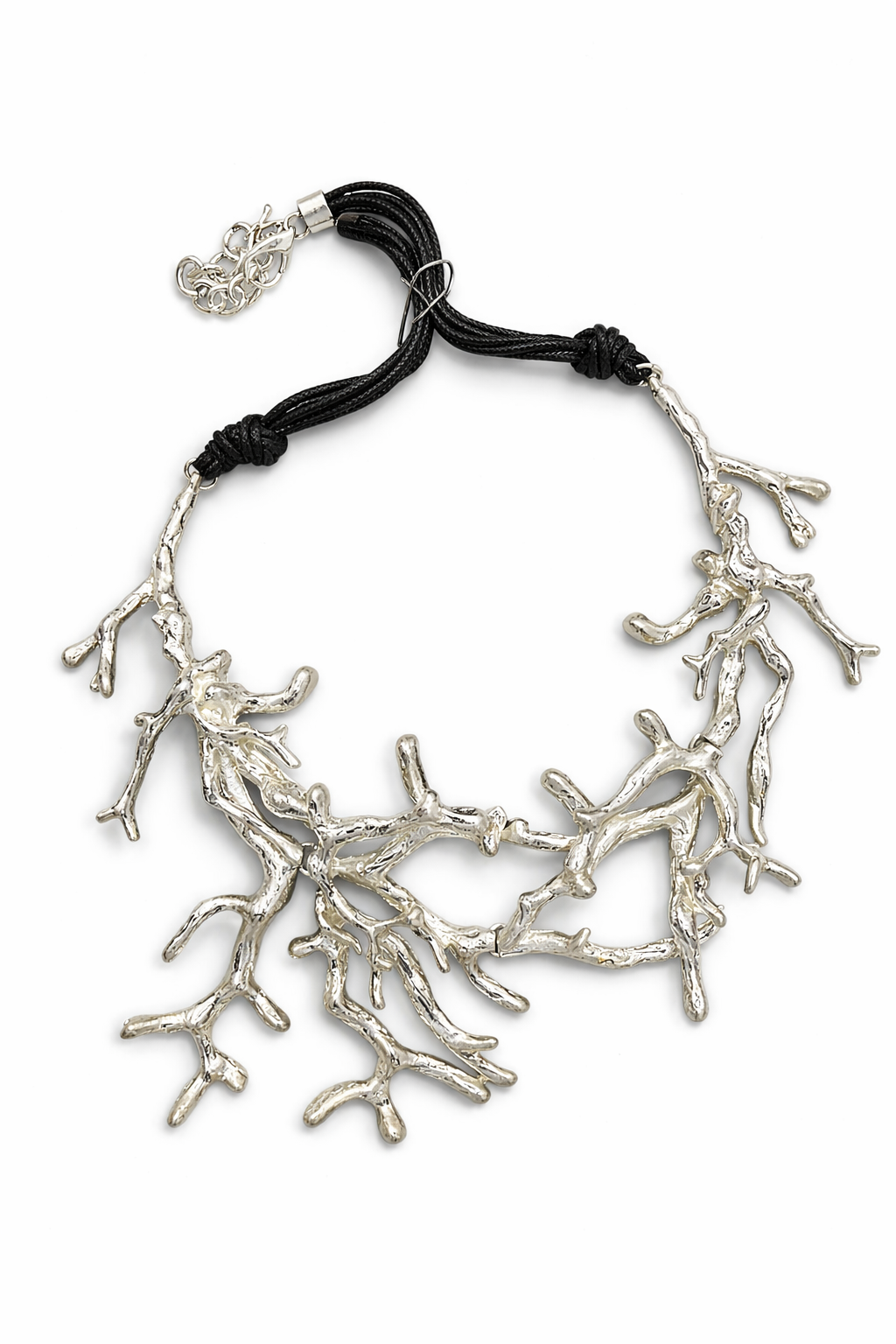 Este collar se destaca por su diseño inspirado en formas naturales, que le da un estilo original y muy llamativo. El acabado dorado aporta un toque elegante, mientras que el cordón negro equilibra la pieza con un aire moderno.