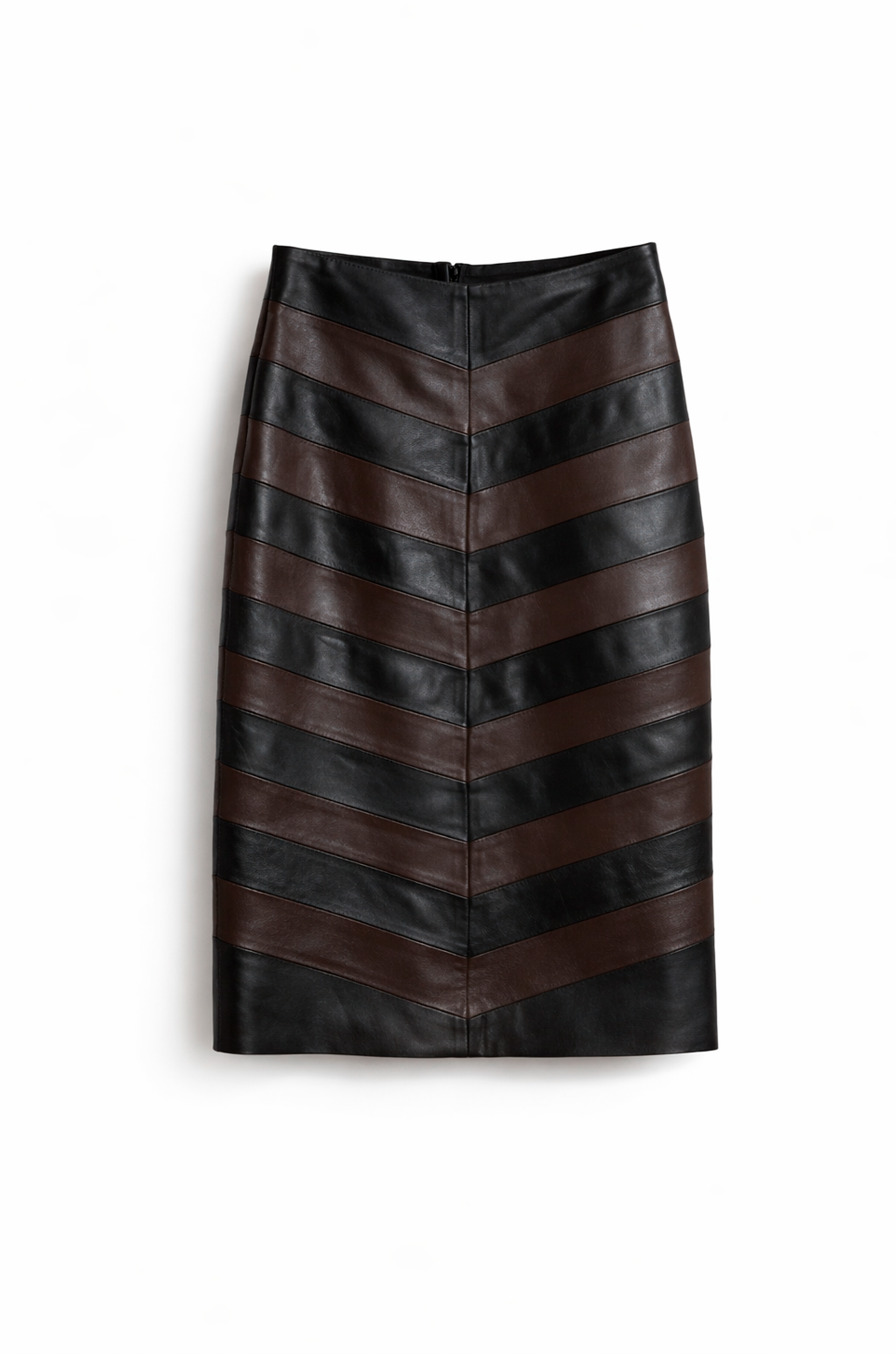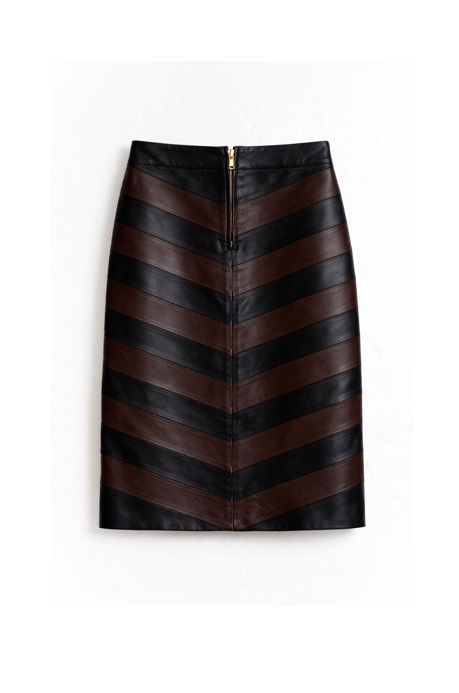 Esta pollera combina cuero en tonos negros y marron formando un juego de lineas en diagonal que crea un efecto visual super original.