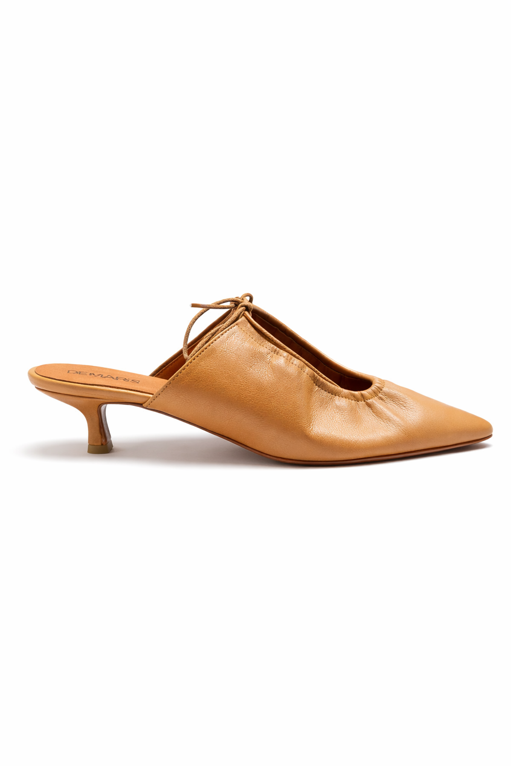 Este stiletto de cuero color suela combina lineas simples con un diseño sostificado.