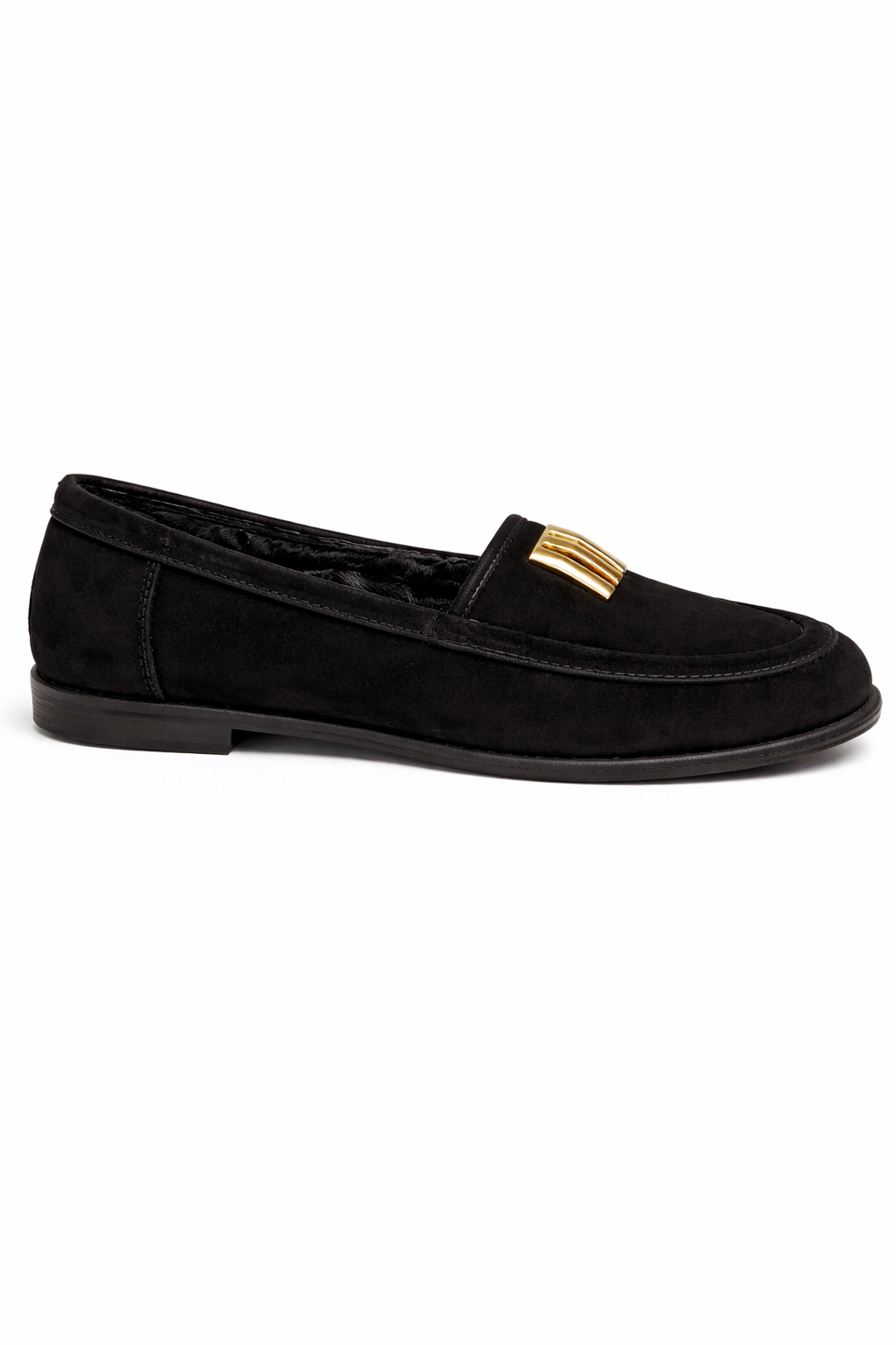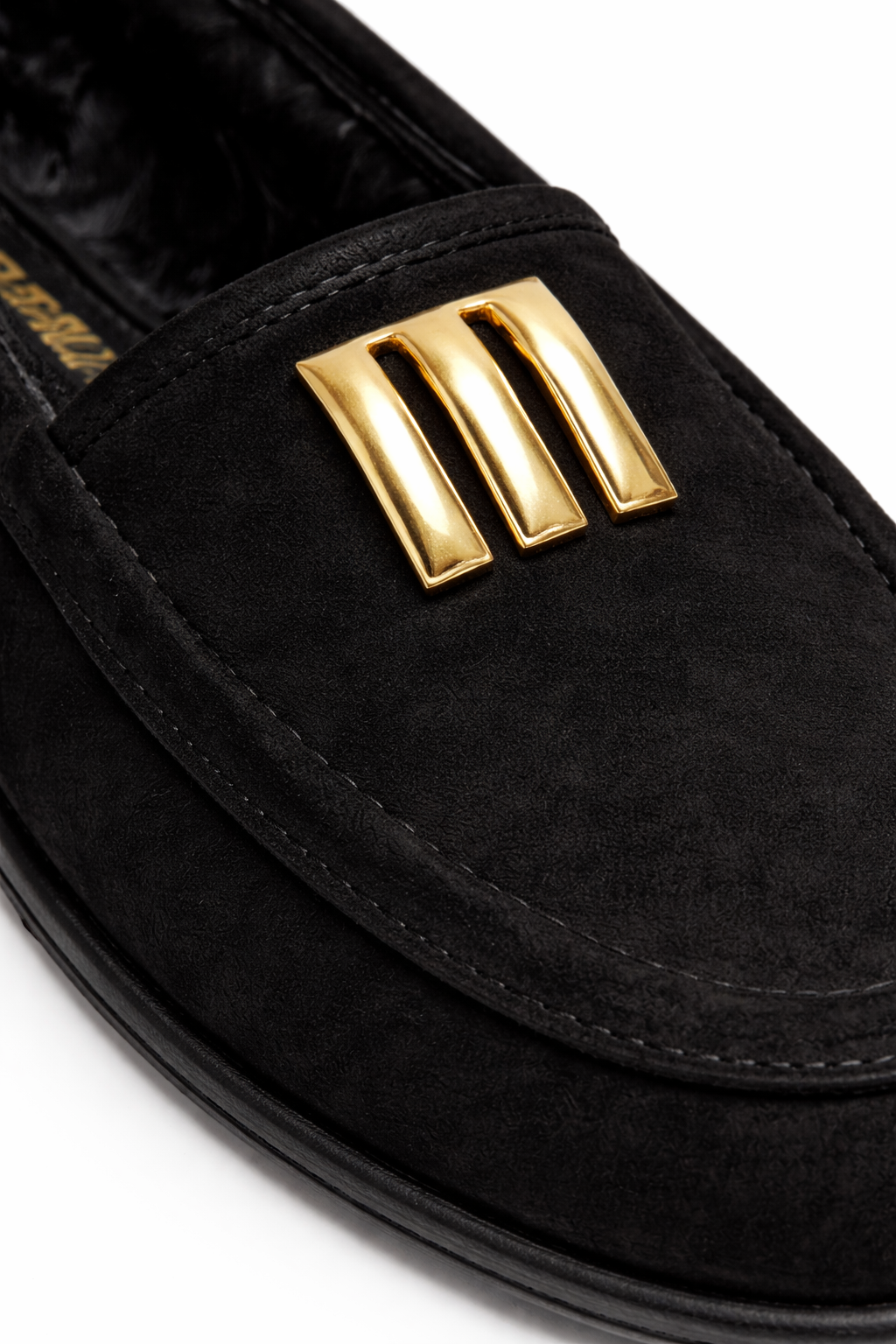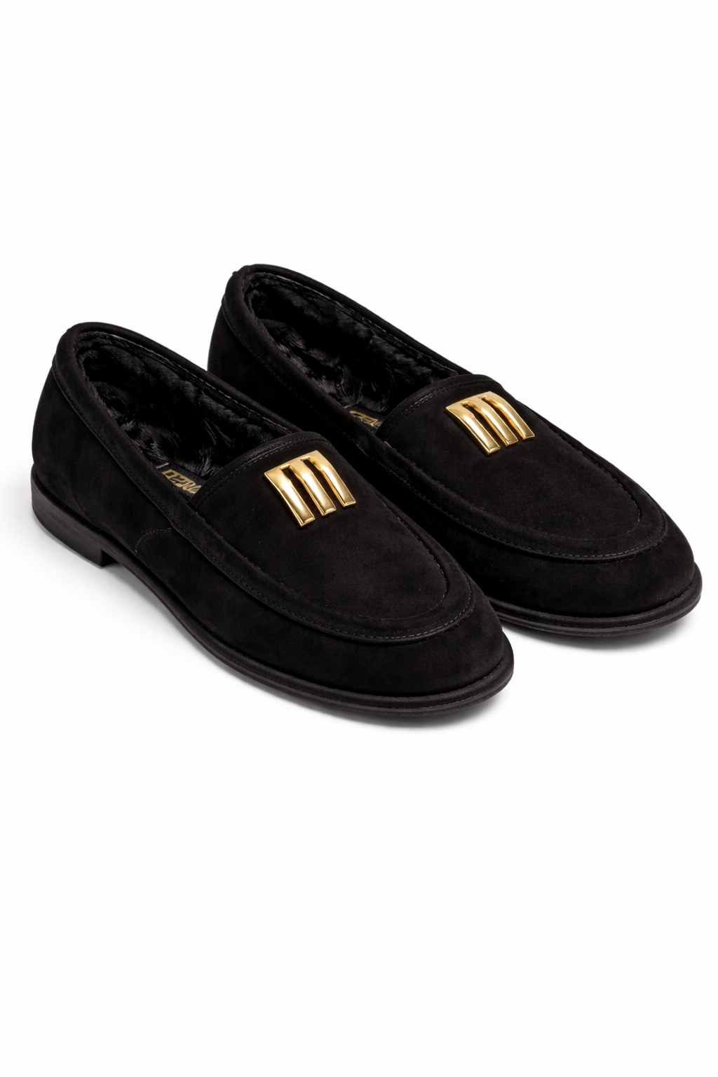 Mocasines de gamuza con nuestra insignia de metal dorado.