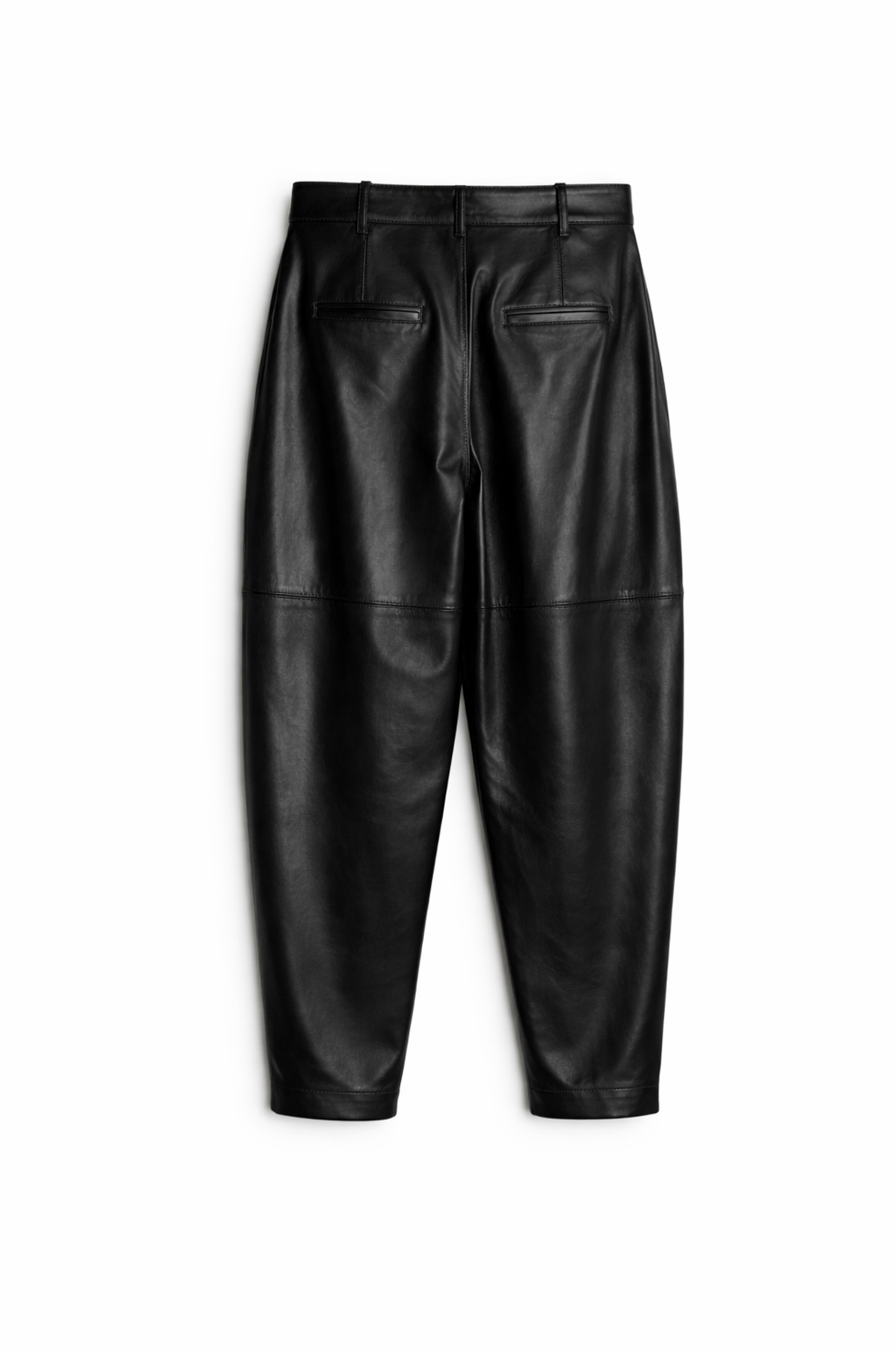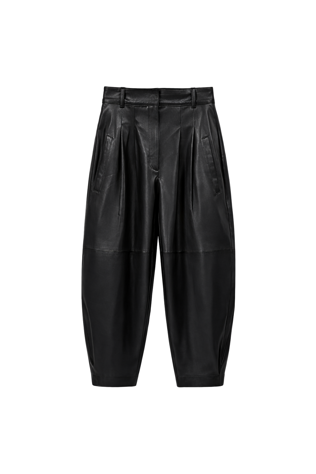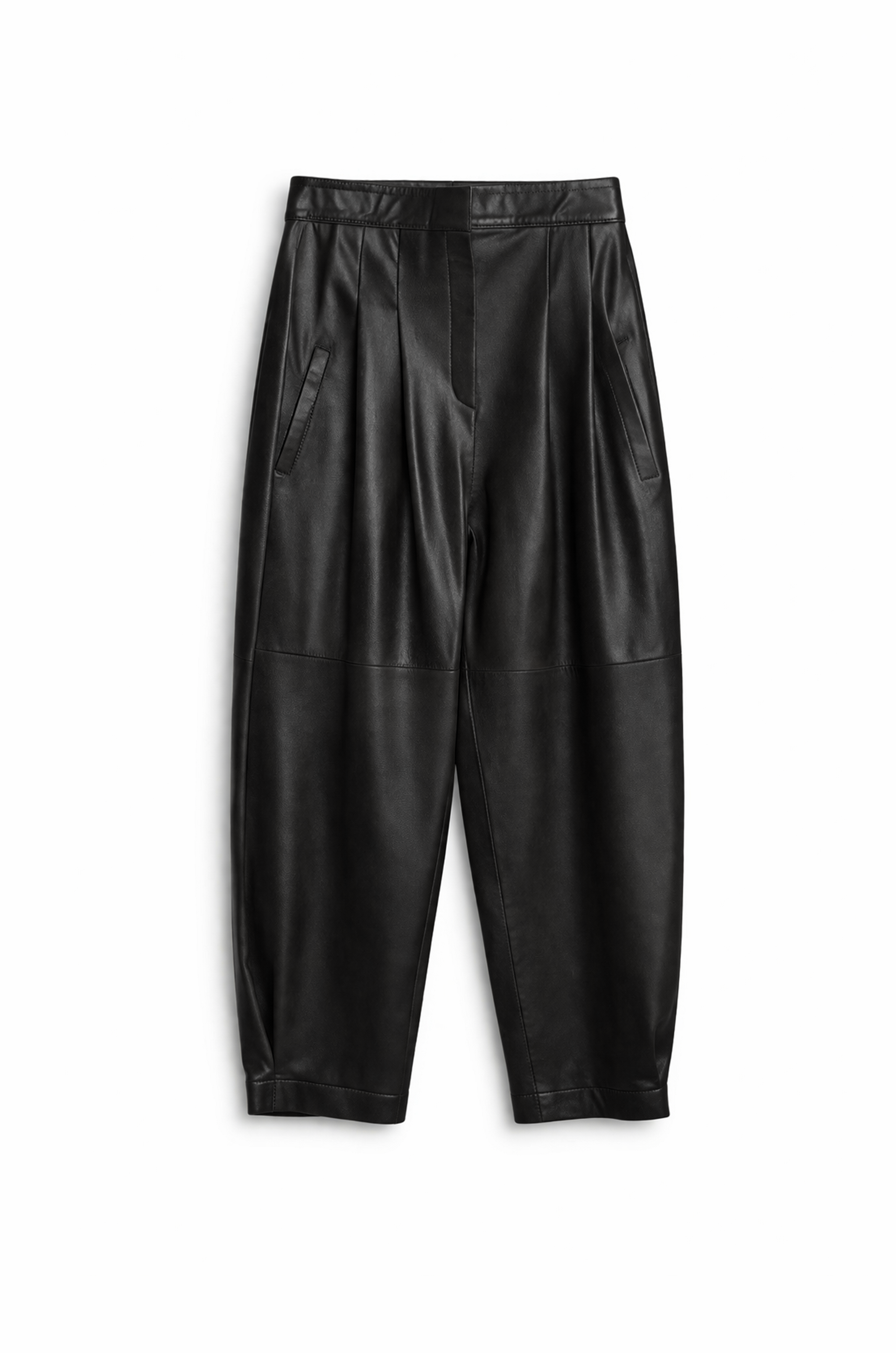 Este pantalon de cuero se destaca por su diseño amplio y pliegues en la cintura, que le dan movimiento y un look moderno.