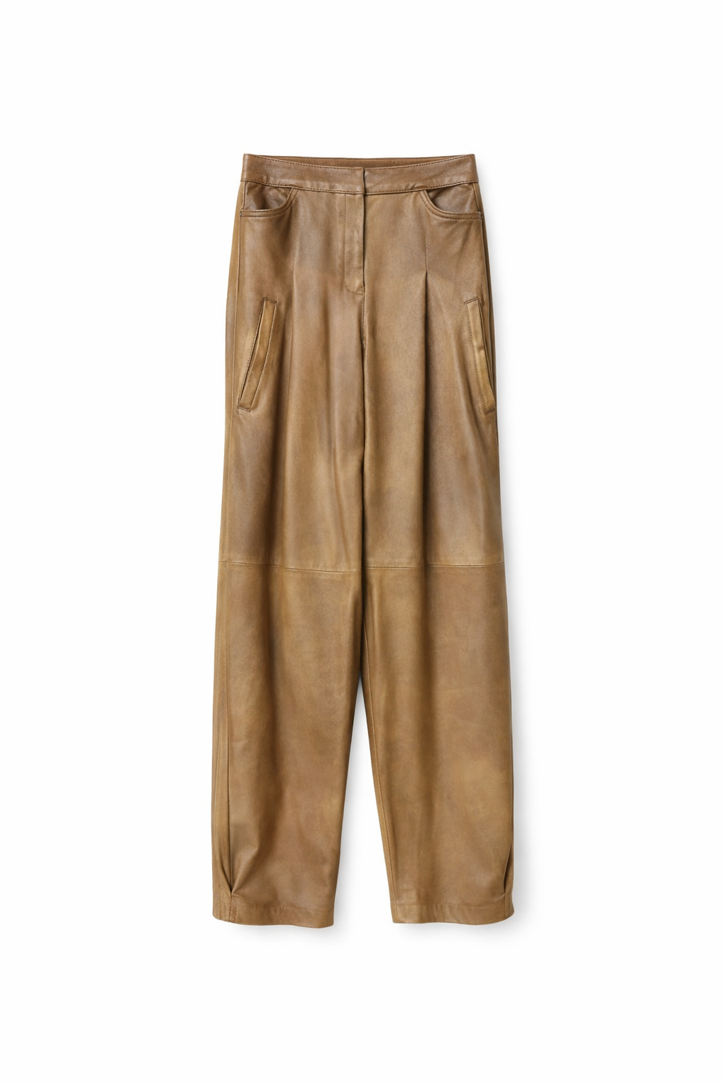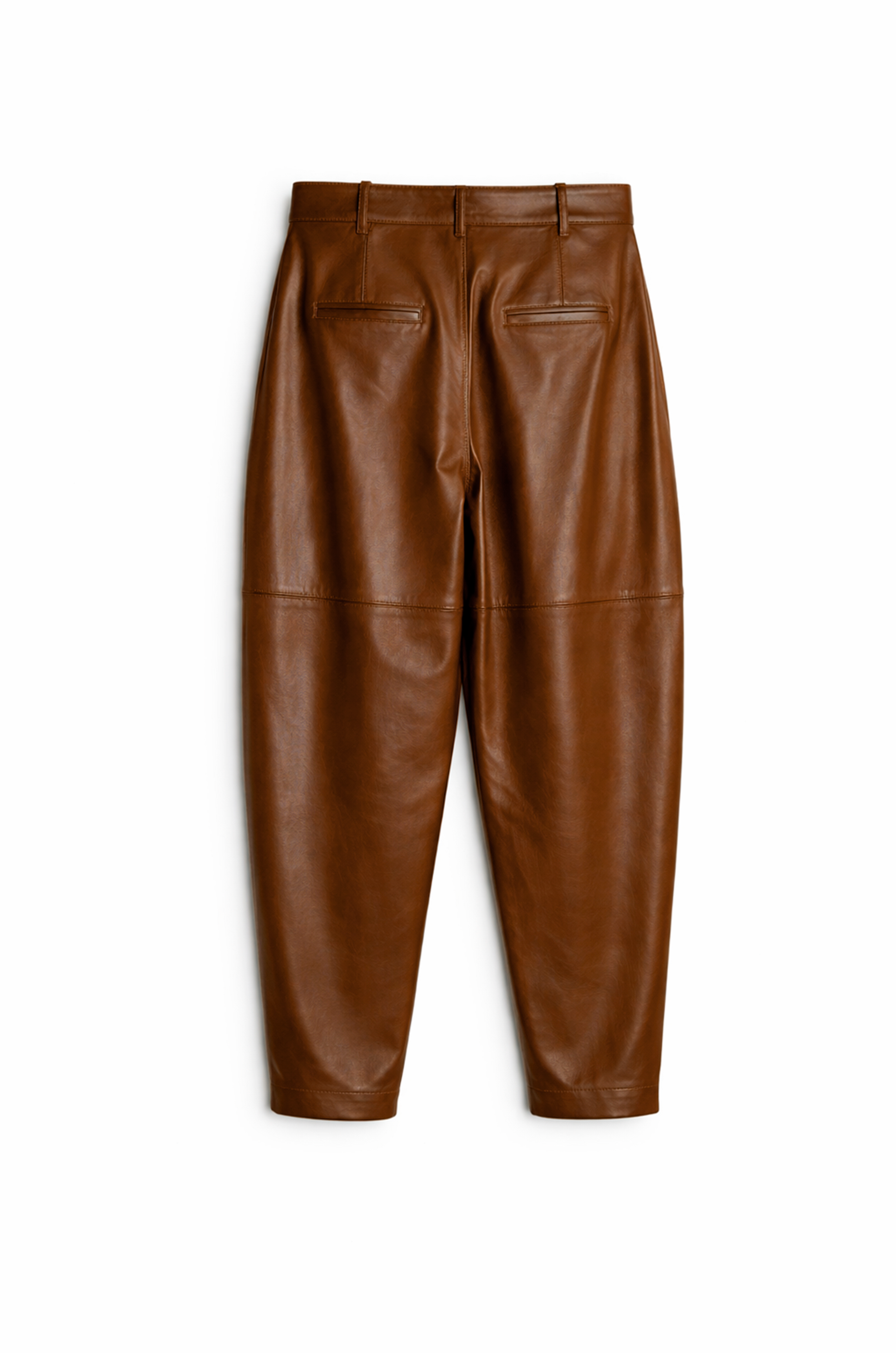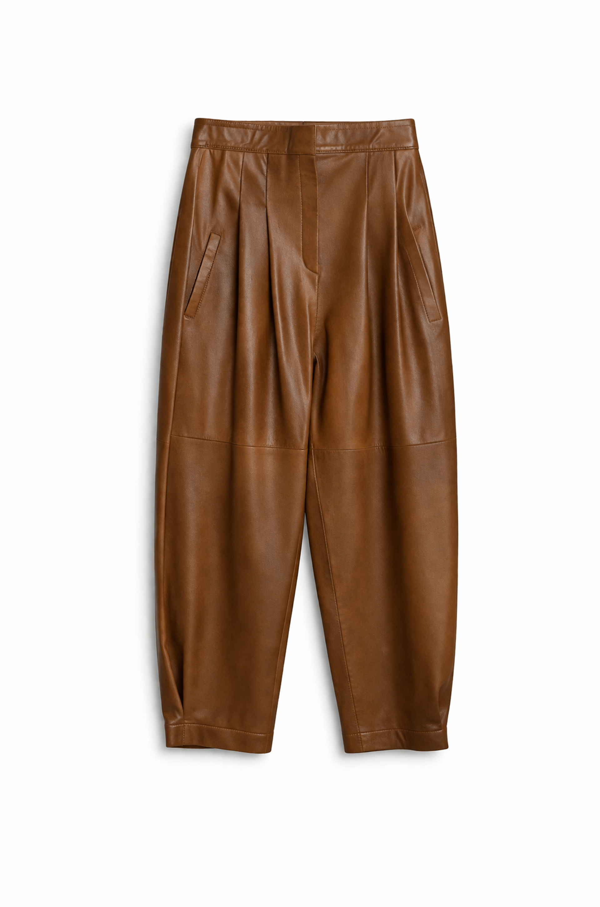 Este pantalon de cuero se destaca por su diseño amplio y pliegues en la cintura, que le dan movimiento y un look moderno.