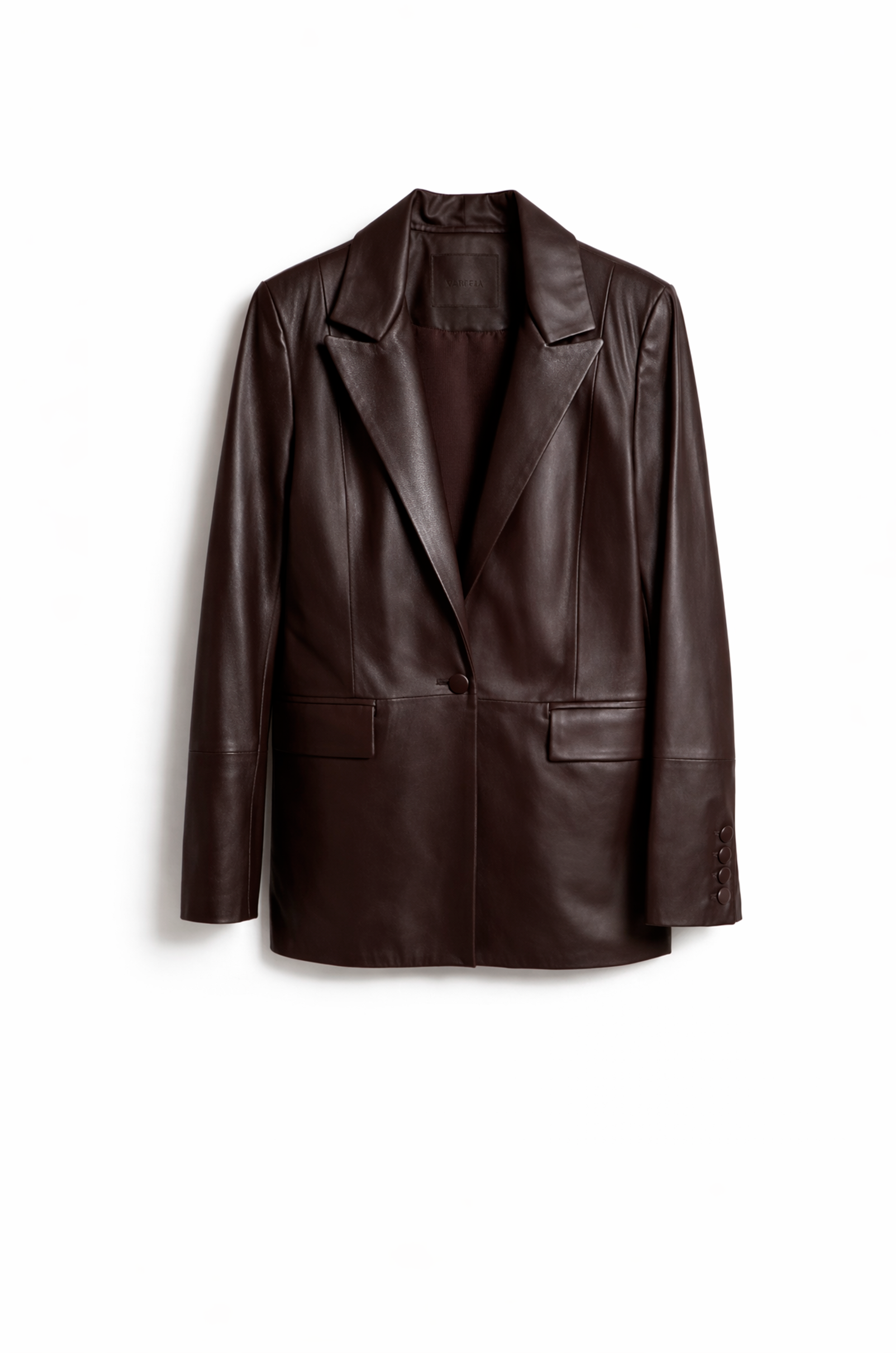 Este blazer de cuero es de esas prendas que elevan cualquier look sin esfurezo. Tiene un diseño simple y elegante con solapas amplias, botones frontal y bolsillo que le dan un toque moderno y muy canchero.