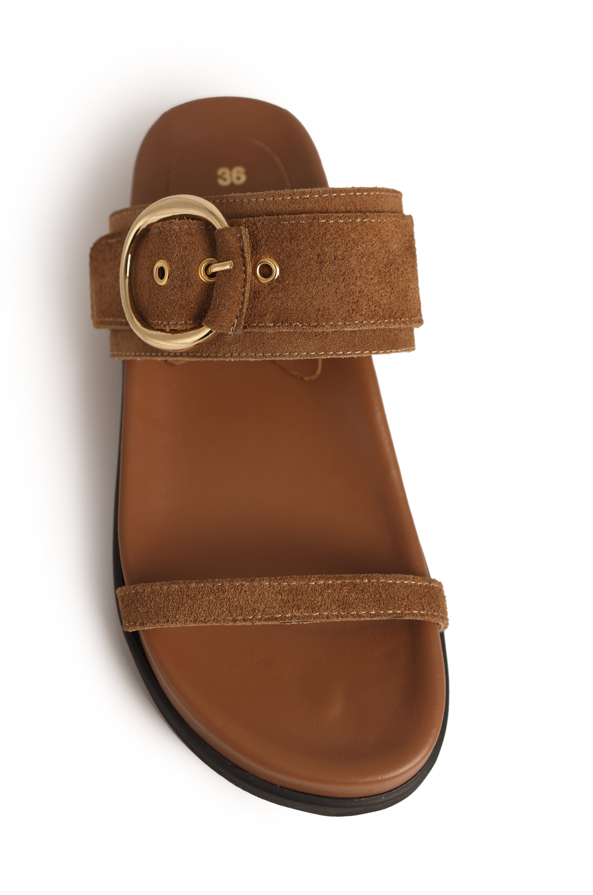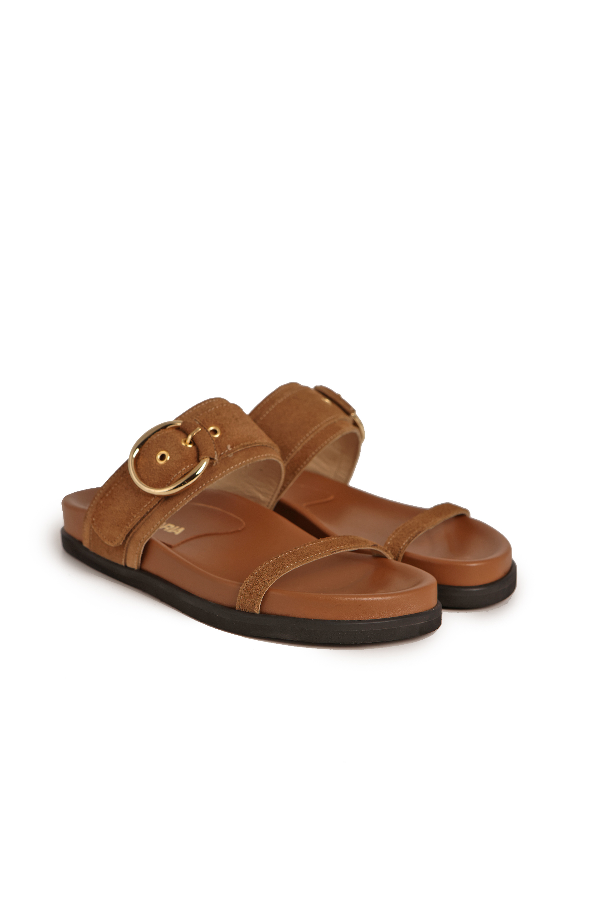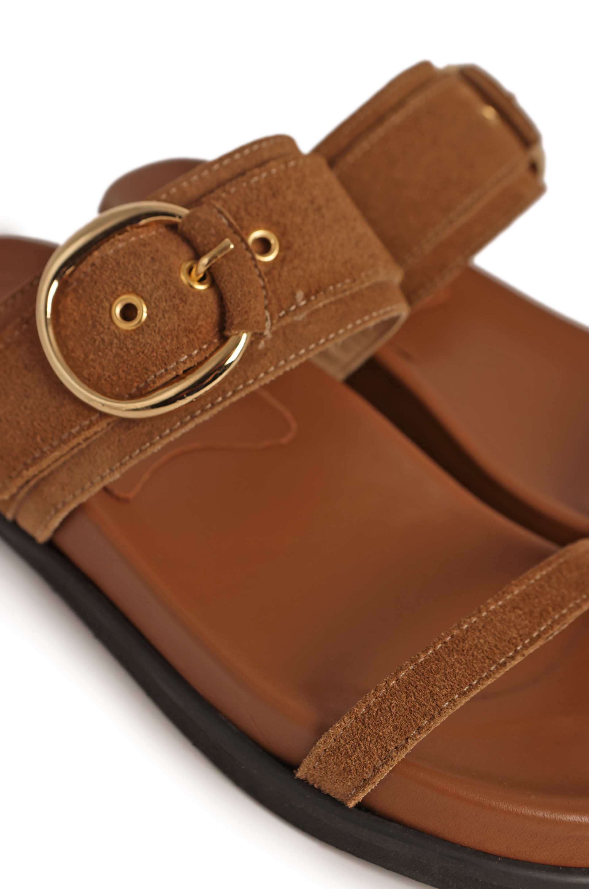 Sandalias de gamuza con hebilla dorada.