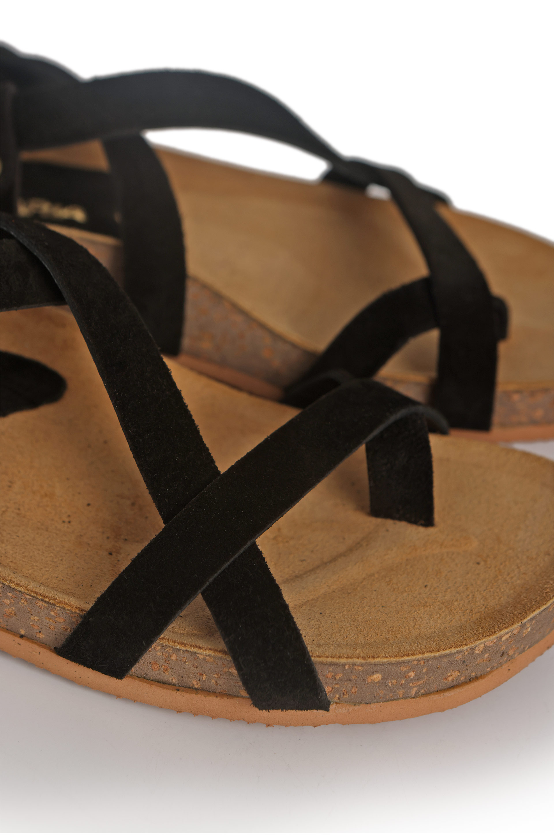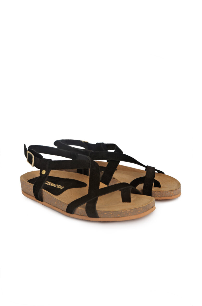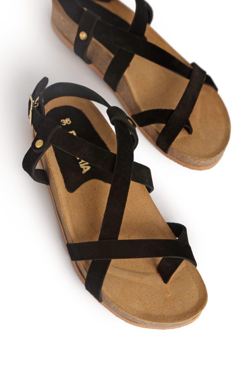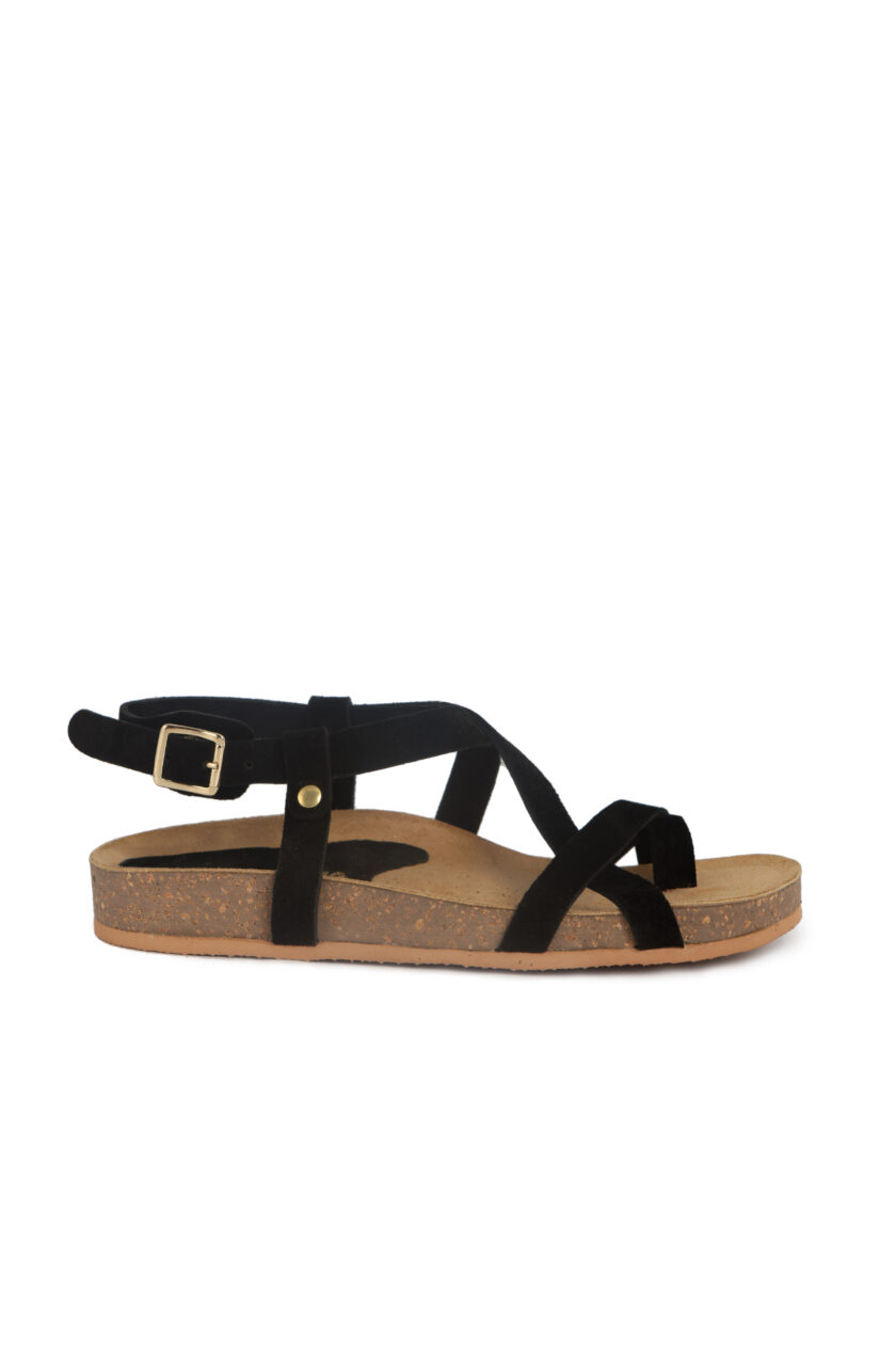 Sandalia de gamuza con tiras finas cruzadas y hebilla lateral.