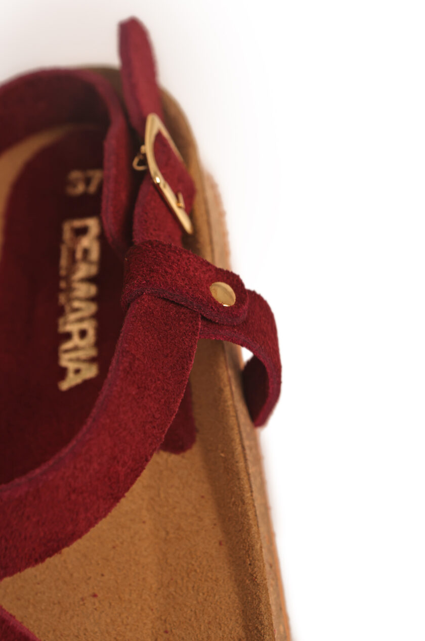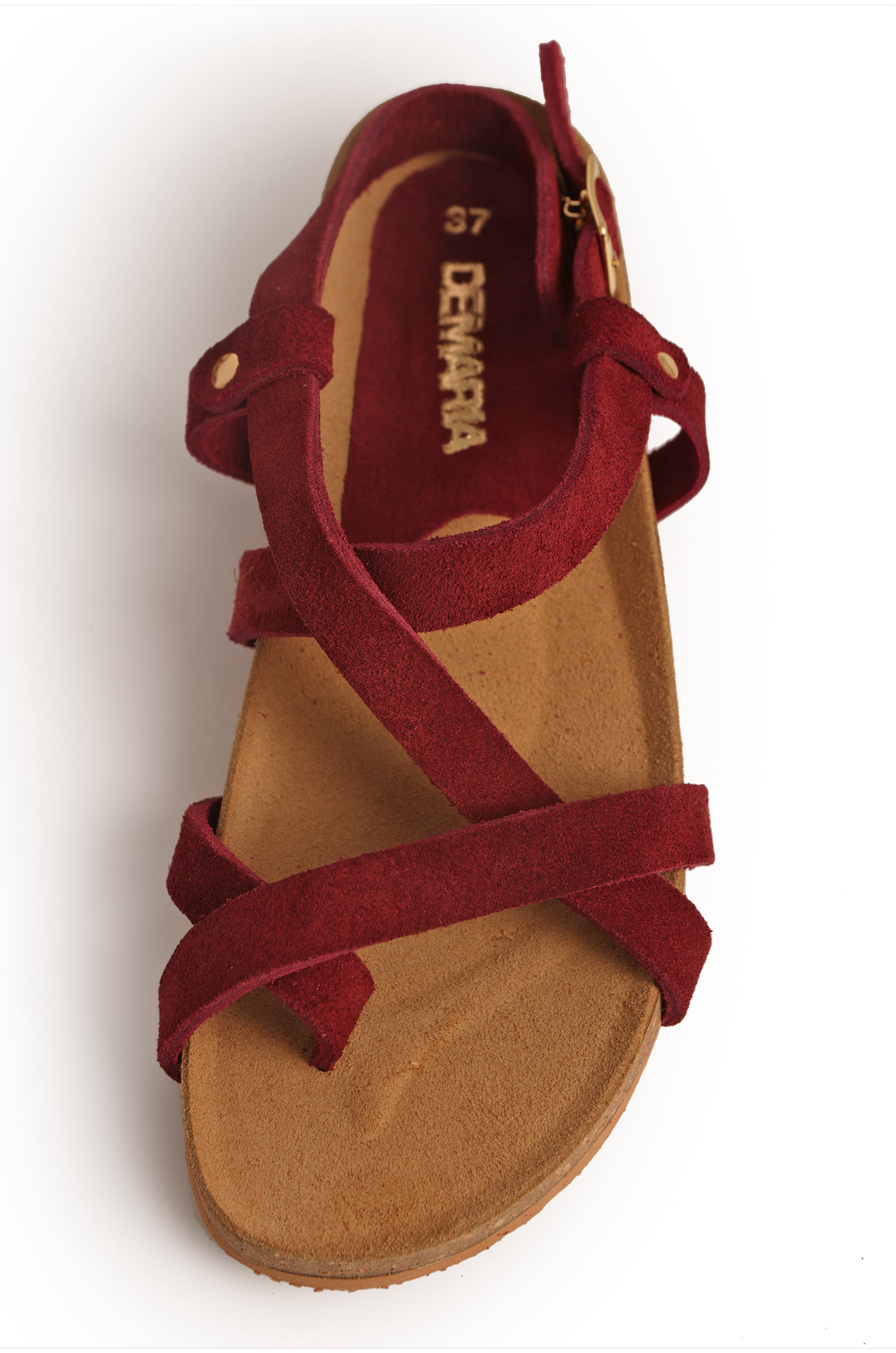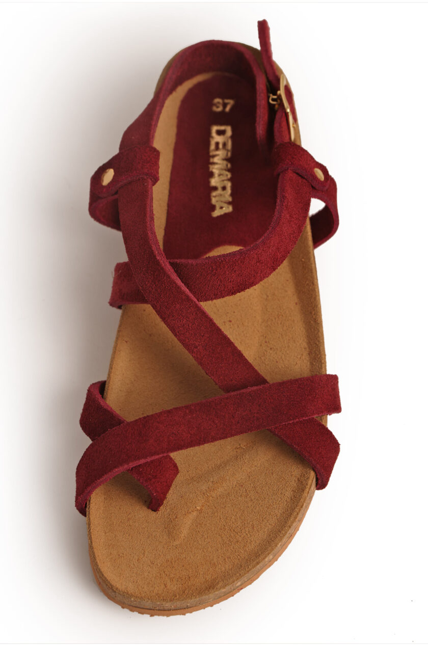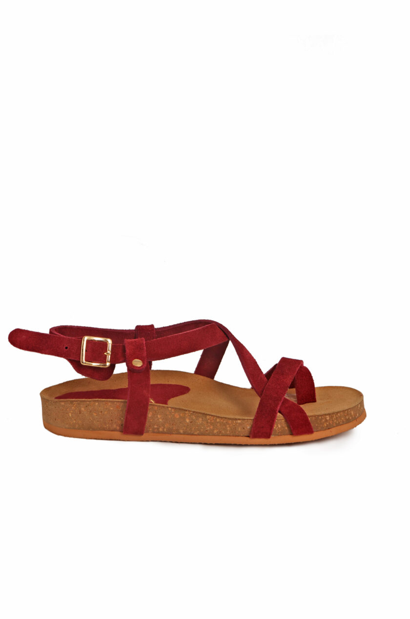 Sandalia de gamuza con tiras finas cruzadas y hebilla lateral.