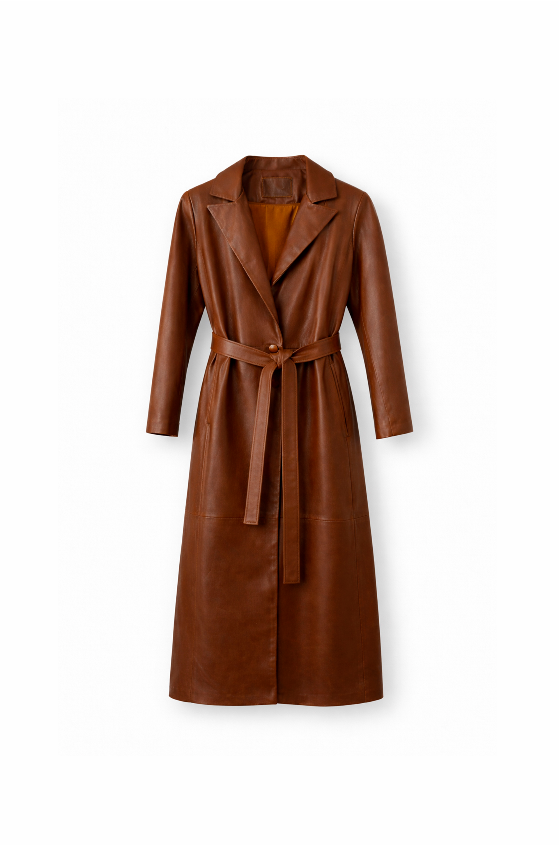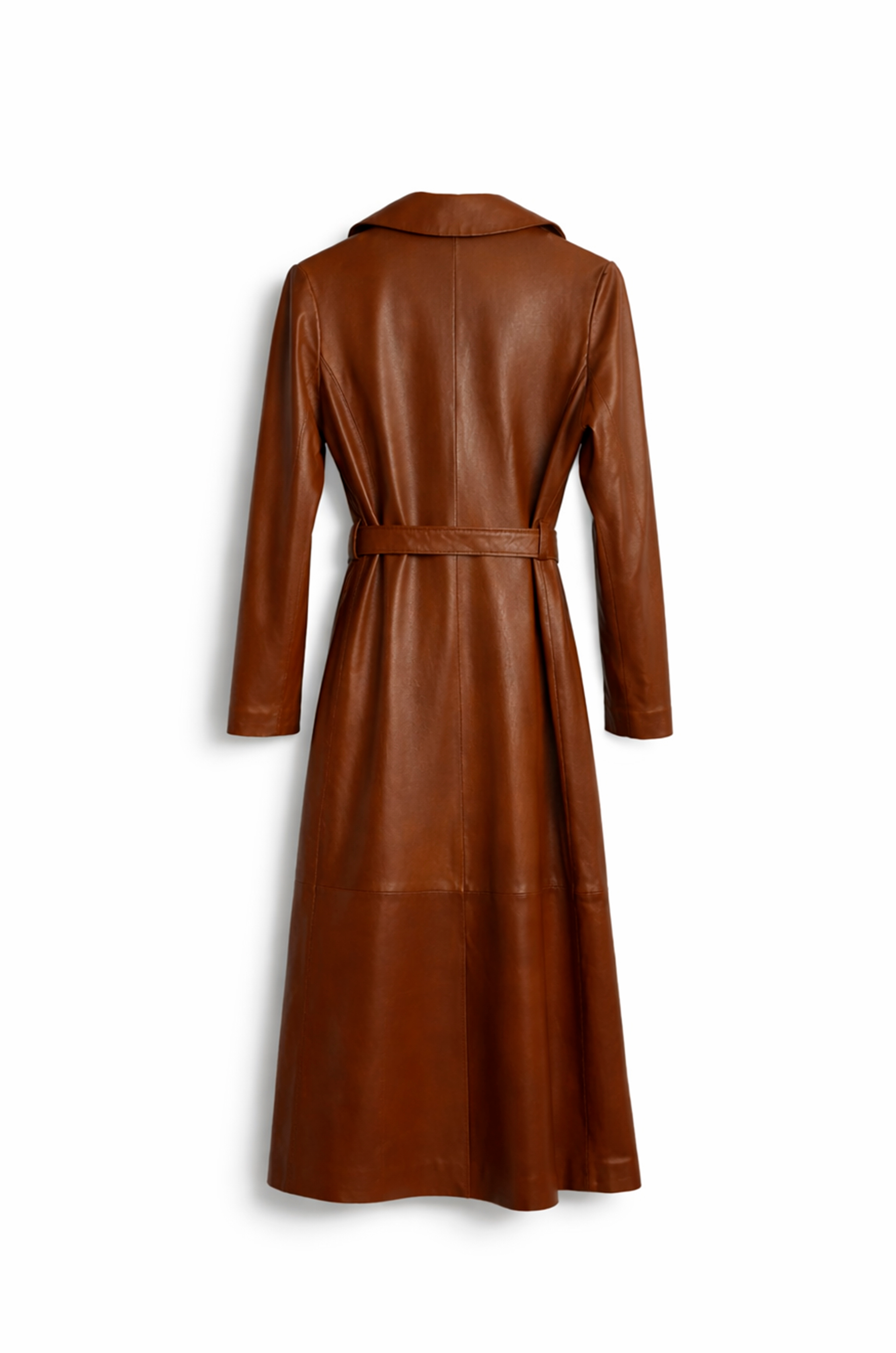Este tapado de cuero largo tiene todo para convertirse en el protagonista del look. El diseño cruzado con solapas amplias y cinturón permite ajustarlo en la cintura y darle la forma que mas te guste.