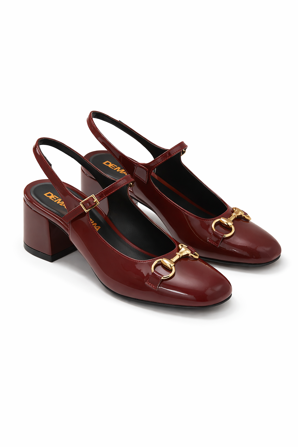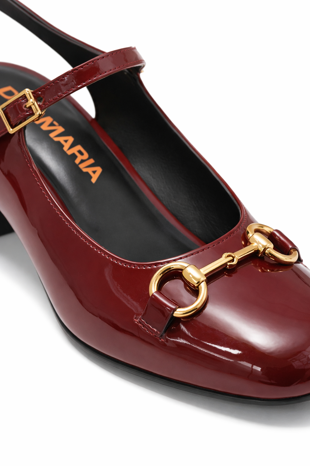 Zapato de charol con aplique dorado.